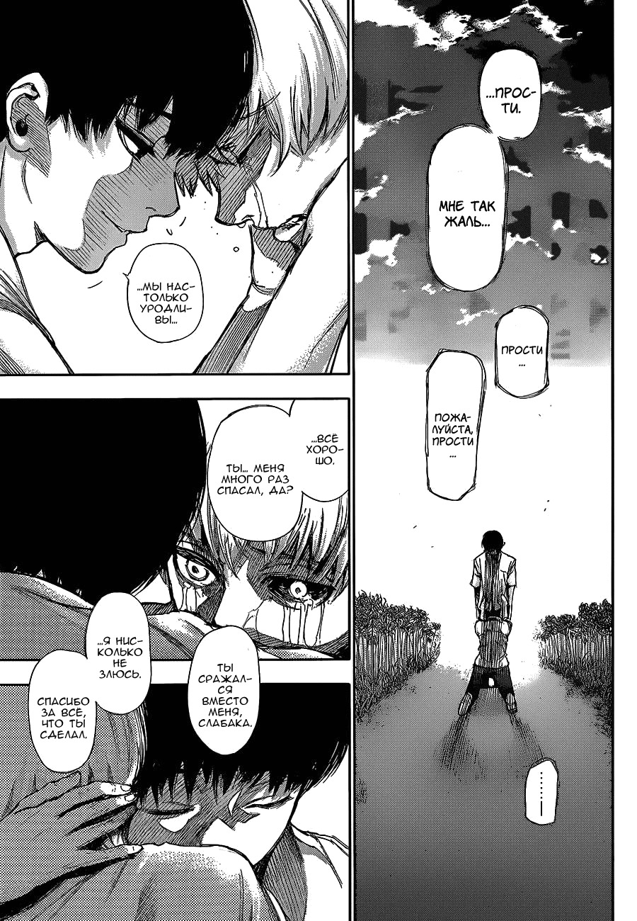Главный герой манги Токийский Гуль, Канеки Кен, - вовсе не тот, кого ожидаешь увидеть на месте протагониста "сэйнен" манги. Кен - обычный студент, которому нравится читать. У Кена нет стремления обрести "силу", или "победить их всех". Он лишь хотел, чтобы его беззаботная жизнь продолжалась и дальше. В результате роковой встречи с "пожирателем" (гулем) Ризэ, ему пересаживают её органы (какухо - охотничий орган гуля) и его жизнь, как человека, обрывается навсегда. Но сводится ли эта история лишь к тому, что он "ломается", не желая обрести силу "пожирателя" (и я специально привёл дословный перевод выдуманного автором манги слова). Почему он вообще отрицает её, не принимая, как должное? И тут я подхожу к основному мотиву этой манги. Истории о вражде, которая основывается на потребности к поглощению, и о неопределившемся человеке, который встал промеж неё.