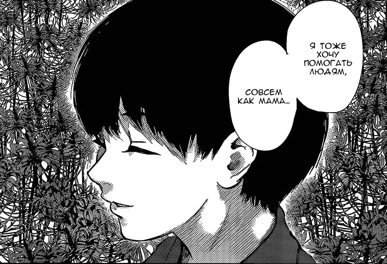 Мать Канэки Кена - человек, (посредством физического насилия, и игнорирования) прививший ему мысль о том, что "вместо человека, который прчиняет боль другим -- стань тем, кто берёт боль на себя" с виду, очень хороший человек, который стремится делиться своими трудом и благами с окружающими. Но вся ли это картина? Человек, который больше всего нуждался в ней -- ни кто иной, как её сын. Человек, который всего этого не получил, из-за того, что его мать "заработалась".