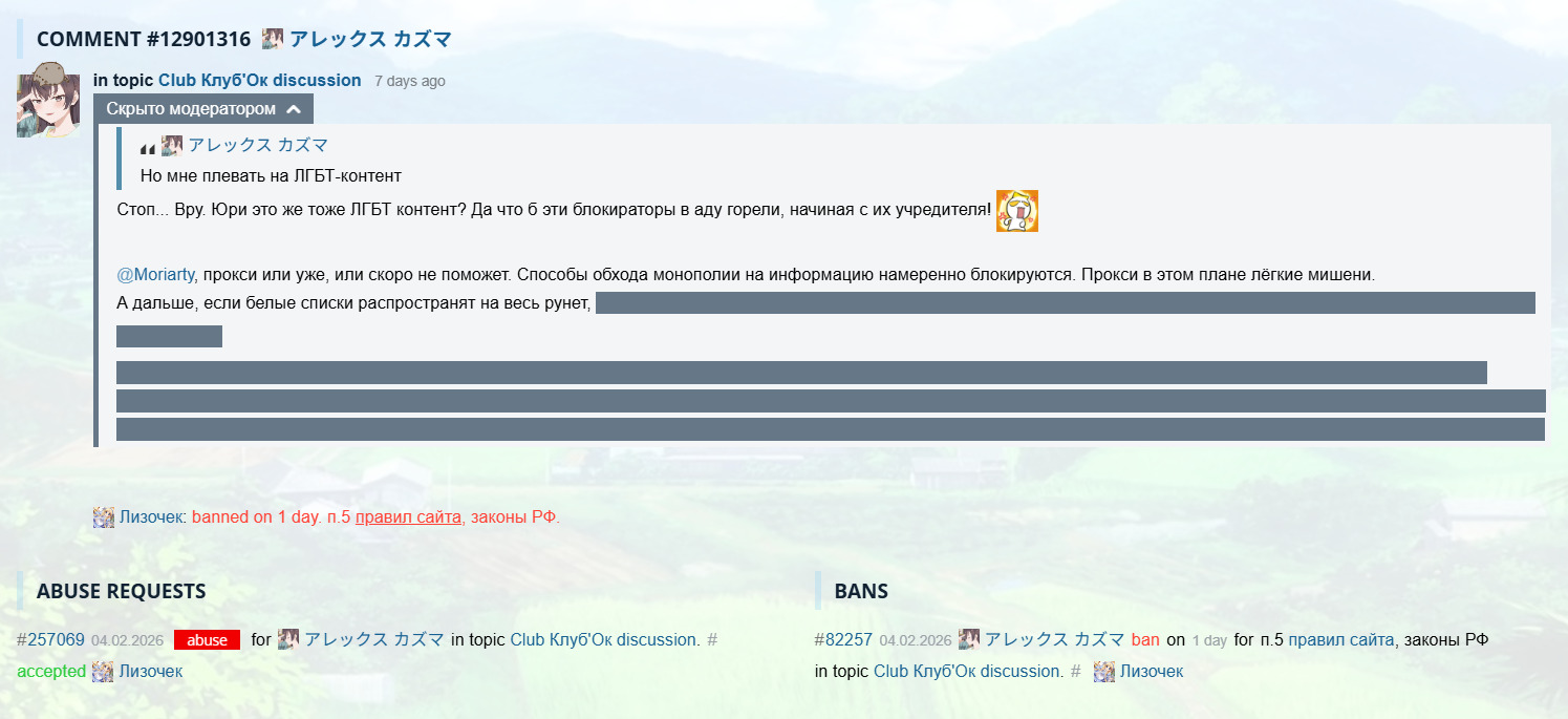 По правилу 5 "законы РФ", ещё и по доносу: