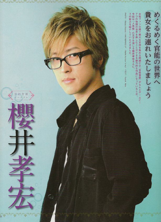 Такахиро - удивительный сэйю, у него особенный тембр, который невозможно не узнать. У него есть особый бархатистый голосовой ход в нижнем регистре, которого я не слышала ни у кого. Такахиро прекрасно озвучивает как наивных мальчиков, так и взрослых бисёнэнов, которые источают ауру крутости и пафосности на километры вокруг. Причем, озвучивает в верхних и нижних регистрах он с легкостью. Для меня роль Аптекаря является самой потрясающей его ролью и готова пересматривать "Мононокэ" снова и снова даже просто ради того, чтобы послушать речь Сакурая. Каждая роль Такахиро хороша по-своему, поэтому я ценю все работы в его исполнении.