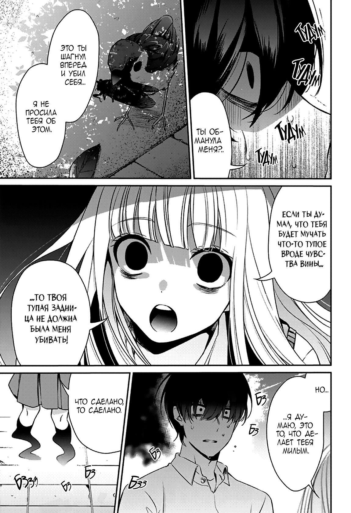 Прекрасный образец ваншота. Крайне сильная работа, не отпускающая до самого конца. Здесь хорошо всё: Хорошо прописанный характер Сары, сюжетные повороты, которые обычно противопоказаны ваншотам, однако идеально выстроенные в конкретно данном произведении, гнетущее главного героя чувство вины и, конечно же, финальная сцена, подбирающая до нутра и расставляющая всё на свои места. Помимо того, что нам подносят на блюдечке, есть и поле для домыслов. В частности - многочисленные звуки вибрации и стук сердца на последних страницах манги, которые как бы намекают, что это вообще может оказаться больным сном главного героя (Да, классический сон собаки). Всё таки, у мёртвых людей сердце не стучит, да и вибрации из ниоткуда не берутся. По крайней мере, я для себя так трактовал эти звуки, было бы интересно услышать чужое мнение на этот счёт.