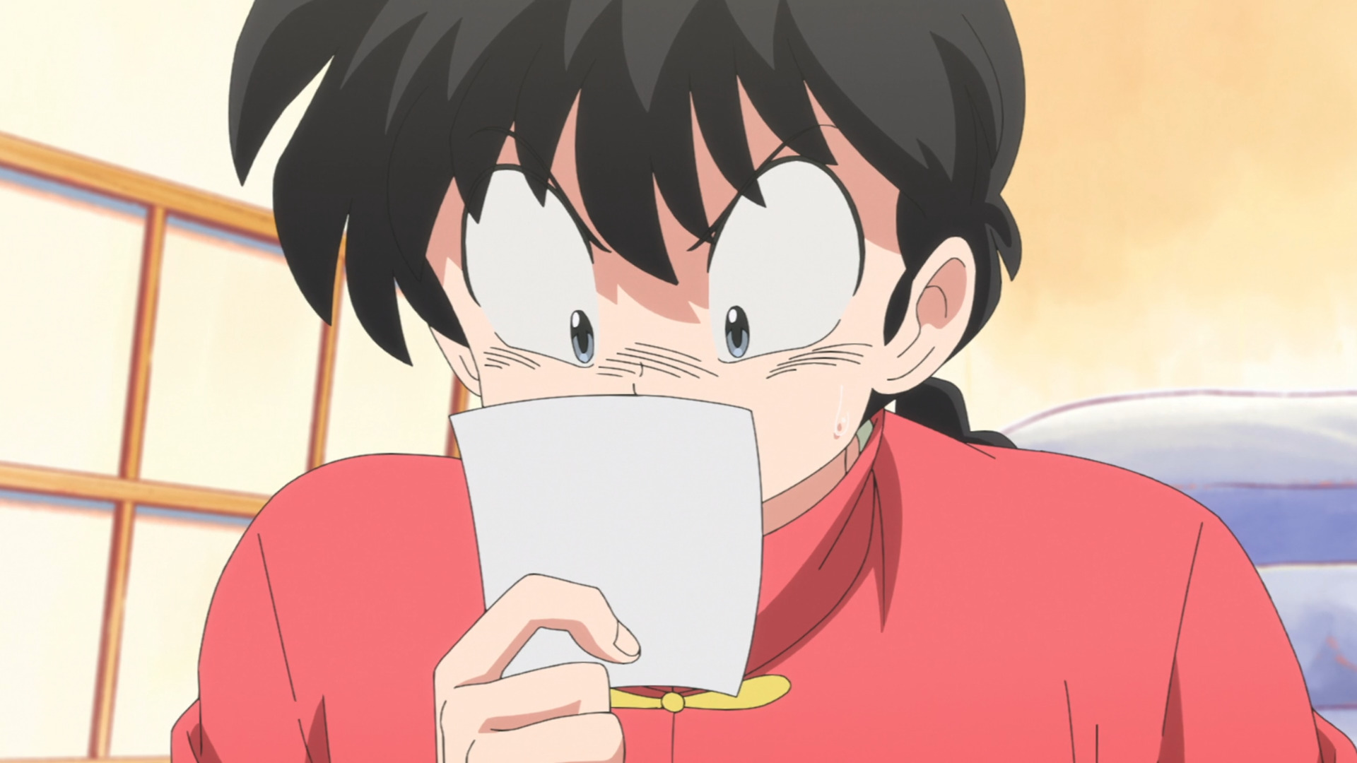 Которая в ремейке А - исполнена с отсылкой, B - отсылает к 7 серии, после событий которой в этой серии Аканэ спокойно просит Ранму помочь, а так же к 1 серии первого сезона, где Аканэ была напугана незнакомцем в ванной, как в этот раз её напугал незнакомец в маске.