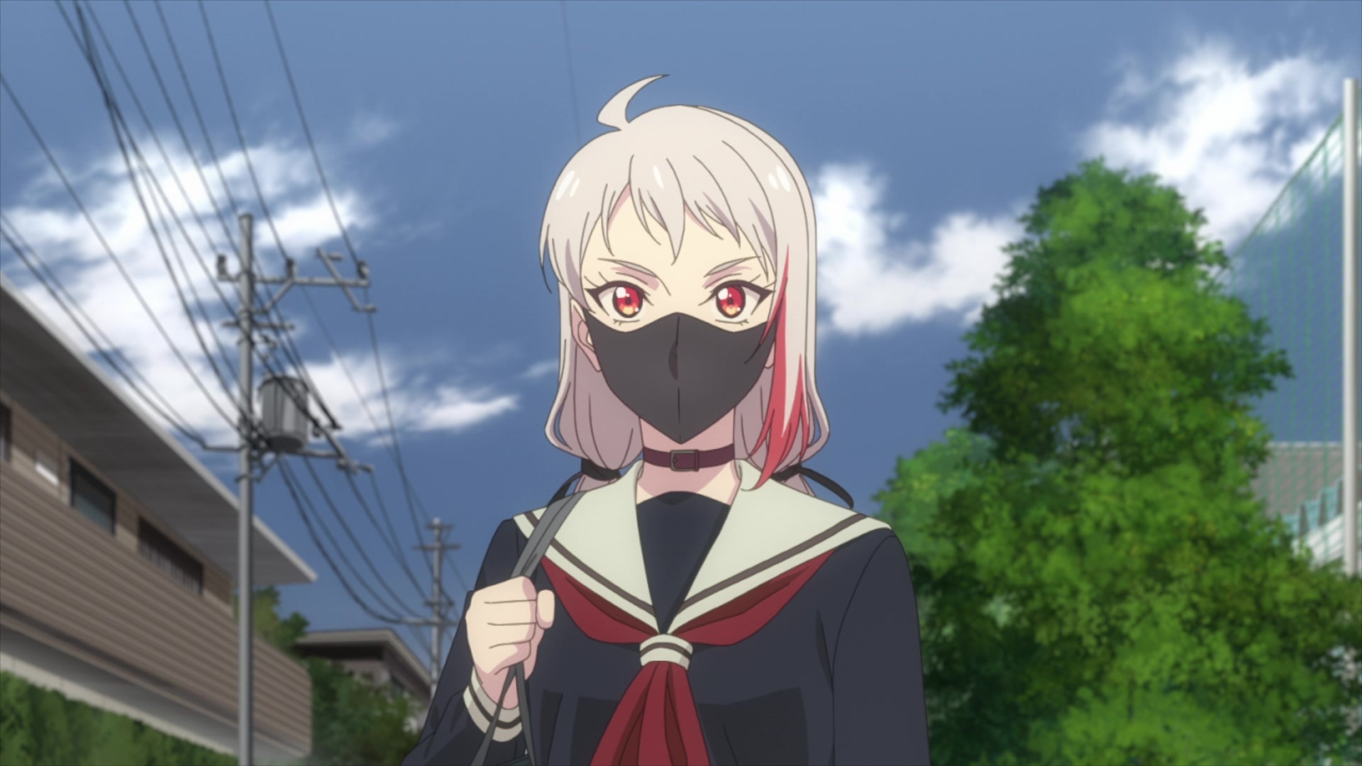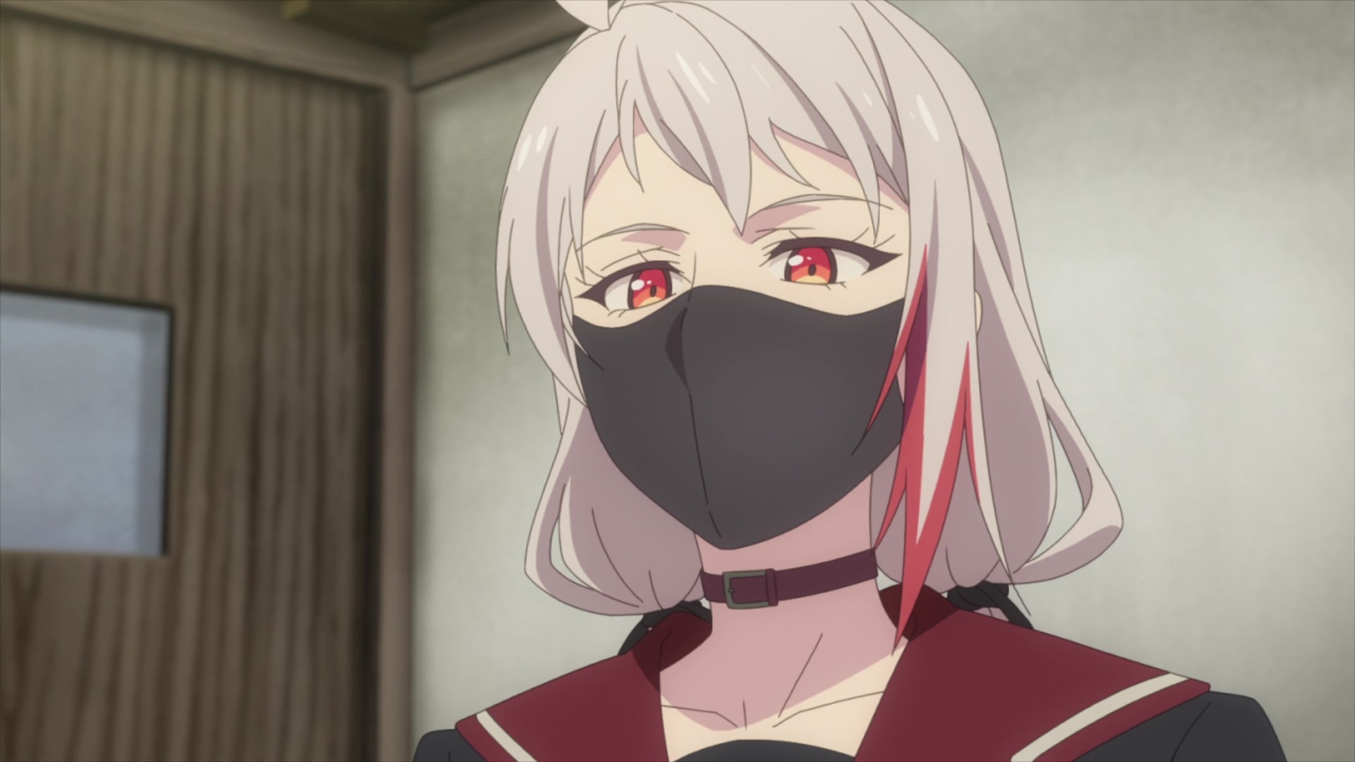 (на самом деле это псевдокаре, так как волосы у неё ниже колен) с выкрашенными в красный, под цвет глаз, кончиками, стильная чёрно-белая матроска и вишенка на торте — тёмная медицинская маска — ну тупа стиль убийцы.