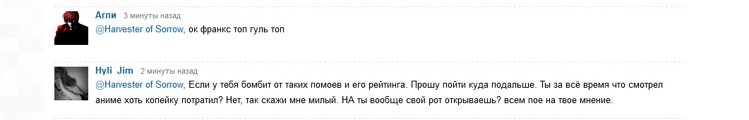 В следствии чего, ответа на ваши претензии, даже если вы адекват - в этом топике дано не будет. (Благо, с такими ответами, видимо, напрягаться и не потребуется) Upd. Ни франкс, ни Гуля я, к счастью, не смотрел, но раз люди, которые отвечают мне такими "шуточками" ставят франксу и гулю оценку больше, чем я данному тайтлу, то, видимо, в их шутках есть доля правды...