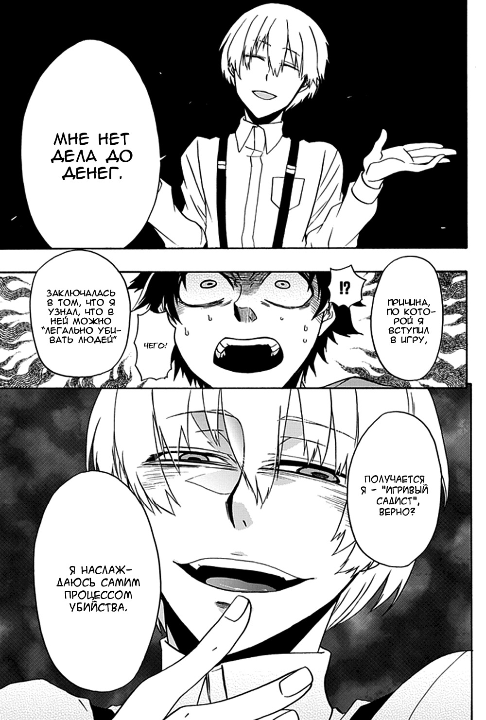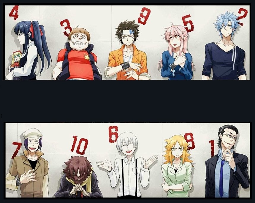 И наконец наш ГГ - Meguru FukurokoujiМэгуру Фукурокодзи. Раскрыт лучше всех на высшем уровне. Все на высоте, его логика и поведения, все это понятно разъясняется. Его стимул прийти на игру, то зачем он убивал тоже понятно. В конце из него я ожидала какого-то психа из-за всего, что случилось, но видимо он стал сильнее и смог измениться, принять себя.