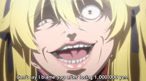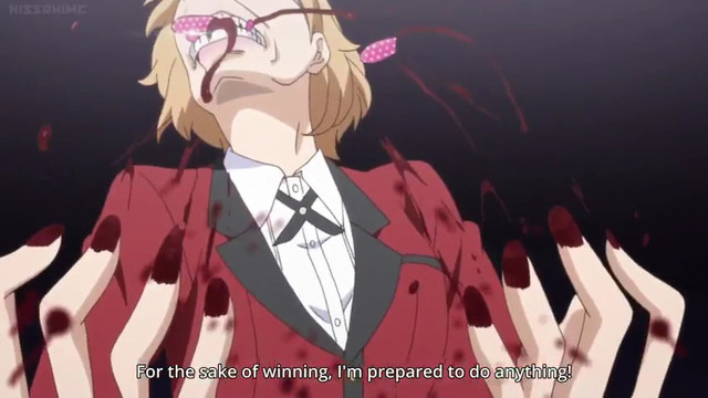 Тайтл о том, как главная героиня раз за разом уничтожает важных шишек по одному и тому же алгоритму (по началу лузаем, уверяя противника в его превосходстве ---> читаем его как открытую книгу ---> изи выигрываем ---> profit). В нем и заключается вся психология Kakegurui. Сюжет очень примитивен и предсказуем, часто происходит .