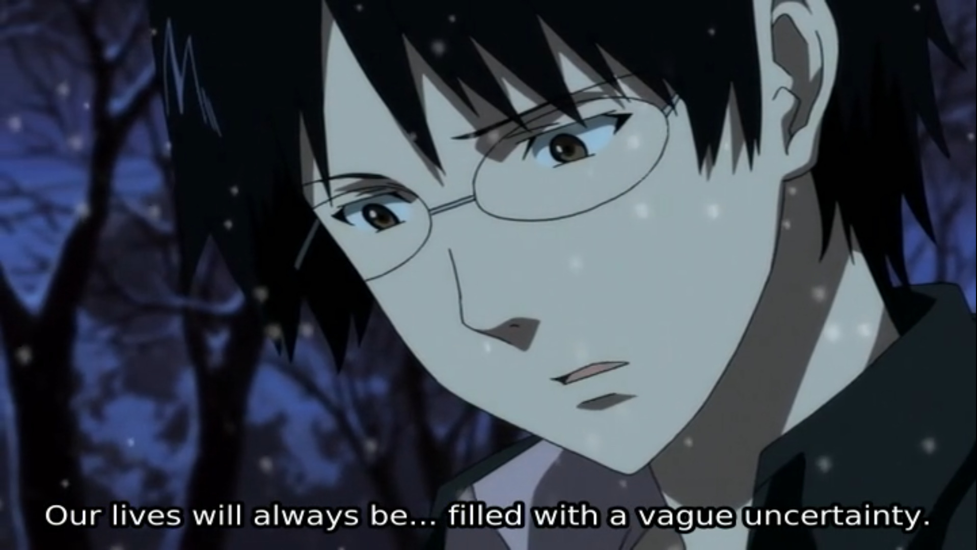 В чём же причина затворничества Сато? Как и в случае с Хитоми, из того, что нам показали о его детстве, о матери, о школьной жизни, ничто не указывает на травму, на какое-либо резкое эмоциональное переживание. Просто однажды, сидя на лекции в универе, он вдруг понял, что ему страшно. Он смотрит на однокурсников и не понимает, кто они. И кто он. И как жить. И почему всё кажется ложью. Он вспоминает слова Хитоми. «Ты не виноват. Я не виновата. Виноваты они. Те, кто плетут заговор против нас». И ведь правда: с миром явно непорядок. Не может быть, что люди сами хотят лгать, предавать и унижать? Нет. Не может. Это заговор. И, так как они сильнее, остаётся только спрятаться.