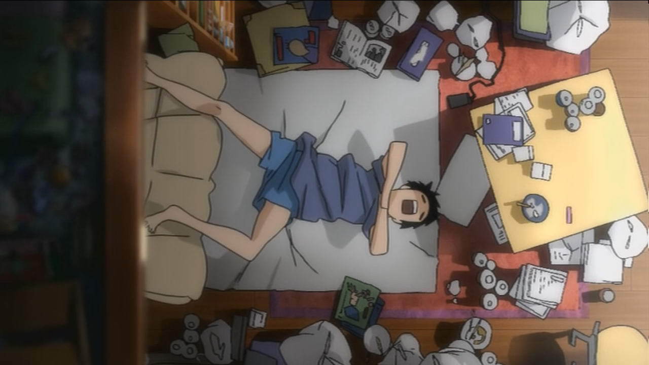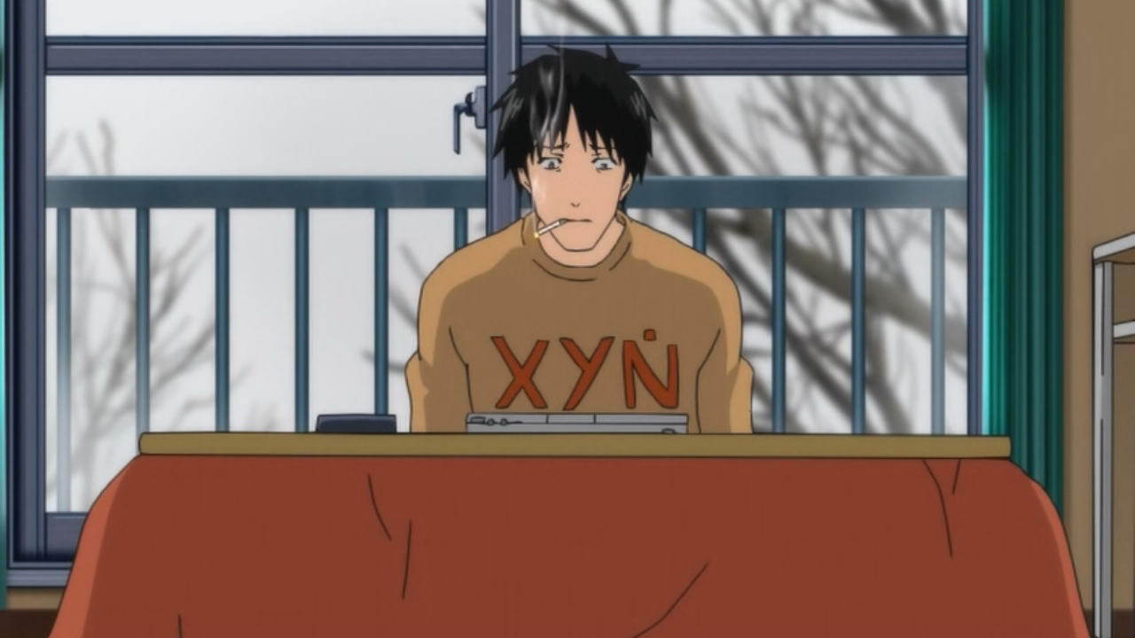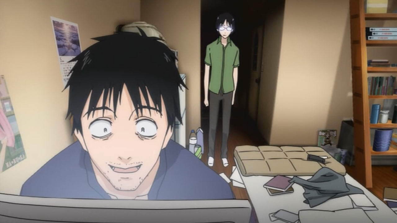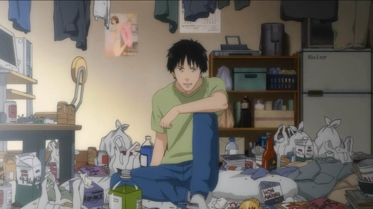 В первой серии нам показывают Сато как Хикикомори Хикикомориевича: он три года не выходил из квартиры, полгода ни с кем не разговаривал (а как тогда еду покупал?), у него глюки - разоваривает с мебелью, кошмарные сны, навязчивые идеи про заговор против него, он спит по 16 часов, много курит, пьет и почти не двигается, что видно по мусору заполонившему весь пол.