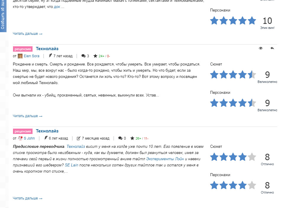 @Holy Ghost,@had25,@Chiru,@Haswi@illuzor_@illuzor_, а ты исправь это. Сейчас Дорохедоро, рецензенты популярны. Разнеси или вознеси их@Tsuri77, но в рецензиях есть оценки. И это косвенный момент, который может отражать мнение автора. Потом из текста можно понять автору понравился или нет. Здесь также ясно, что не понравился. В рецензии нужно объяснить почему это говно, но при этом не забыв назвать плюсы при наличии. А при обзоре можно написать "плохо" и всё@AlexDragon, ты согласен что у этого аниме рейта должна быть 4/10. Мне просто интересно от какого эталона в данном жанре отталкивался автор, как говорят, все познается в сравнении, то есть существует какое-то аниме, которому данный "автор" готов поставить 10/10. такое ощущение, что сюжет этого аниме сравнивался не с другими аниме сериалами, а с прозой Достоевского, тогда конечно я бы тоже поставил сериалу 2/10@kirgizito,@Пазу@Russian 2 D-kun, согласна на сто процентов.@Tsuri77, и как всегда здравая мысль теряется среди комментариев :с@Tsuri77, Ты ведь в курсе, что рецензия или обзор, в котором выноситься оценка чему-то априори субъективна?@illuzor_, а в чем проблема сравнивать с Достоевским?@Пазу