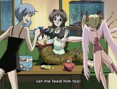 Ламповый комедийный фансервис с текущей кукухой в духе Di Gi CharatДи-Ги Карат: прилипания к потолку, нонстоп записывающие панцу на камеру одноклассники-статисты "B" и "C" (да, прям с надписями на лбу), сквозные люки в квартире и прочее. Может, это даже классика гарема начала 00-ых; визуал-то тут пободрее той же Love HinaЛюбовь и Хина.