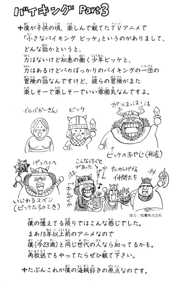 @Seeouli@2.5jigen_made_OK, викки маленький викинг послужил вдохновителем и оды и юкимуры (автора виналанд саги). Я даже предполагала что схожие сцены в этих тайтлах из этого.У Оды прямо в тайтле есть страна викингов - Эльбаф, она же у него страна великанов, с выходцами из которй периодически встречаются герои и которая завязана на некоторых темах внутри тайтла. Само пиратство у него в другом направлении немного. Алсо забавно как вы глянули тайтл и не увидели ничего похожего, кроме "ну викинги это те же пираты" - там в одном опенинге сплошняком ванписо-фишки лел, а обложка - танец из скайпеи))