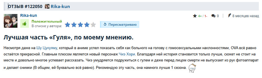 История очень простая, но очень хорошо сделана. Мне нравится, как тут раскрывают тему двуличности некоторых людей, что бывают иногда хуже гулей, и то, что даже такой гуль, как Цукияма, может обзавестись другом.