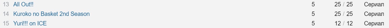 @Bai-r-1,@Bai-r-1@spinosa, ну вот я сейчас смотрю всеми расхваленный топ спокон Куроко, ну вообще интереса не вызывает как All Out. Хотя тот же Юрец, который куда гомосячнее и выше по рейту.@spinosa@Bai-r-1, хорошие тайтлы подобрал, ничего не скажешь@Bai-r-1@spinosa,хех, ну я сужу по шики, тут у Куроко 1 место))@spinosa@Bai-r-1, ты что, наркоман, что на здешние опросы ориентируешься?@Bai-r-1@spinosa,ну ведь на шики много экспертов высокого уровня, они не могут ошибаться)))хах