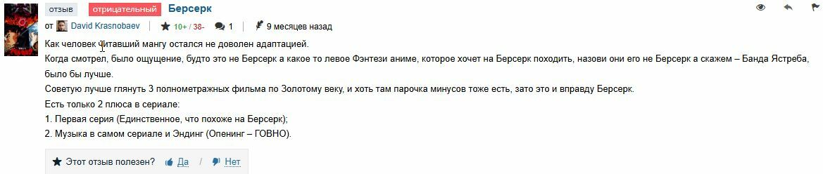 ... тем, кому понравилась условная «Провожающая в последний путь Фрирен» (мне), понравится и Берсерк даже не смотря на тональные различия, потому что Берсерк тоже никуда не торопится, разбирая каждый момент. А тем, кому понравилась условная пивная «Магическая битва» с кучей экшена, Берсерк вряд ли зайдёт, так что вот вам гигачадская прогулка Гатса по офису и на Зуландера.Комментарии