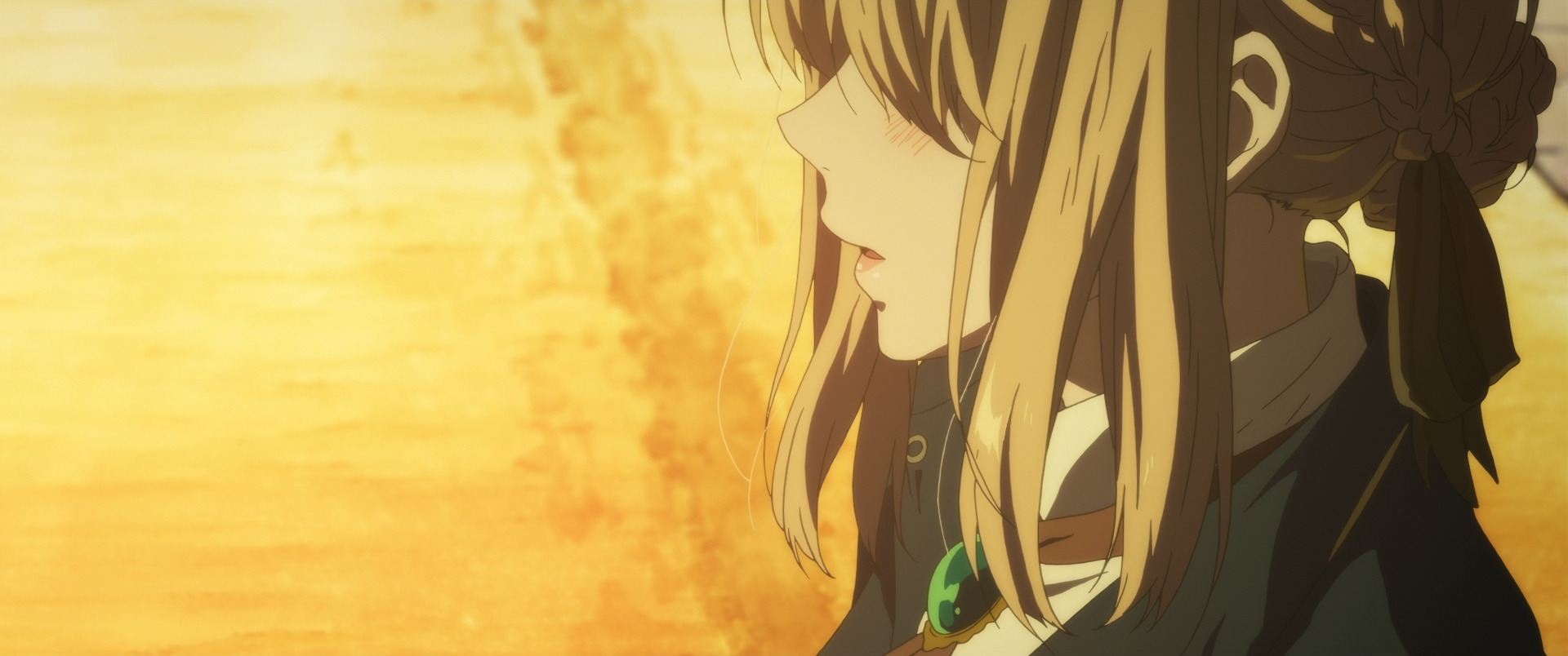 Про визуал. Что тут можно сказать? Я думаю Вайолет Эвергарден во многом и известна благодаря своей картинке. Киото Анимейшн проделали просто титаническую работу, сериал действительно выглядит великолепно. Более того, мне до сих пор кажется, что это в целом один из самых красивых аниме-сериалов современности (ну или по крайней мере 10-х годов). Цвета, тени, блики, анимации постановка в целом, ну всё тут хорошо, я даже боюсь представить то, сколько денег и труда все это дело стоило. А какие у Вайолет протезы! Невероятная работа с детализацией. Если вам не интересен сюжет сериала, то можете посмотреть хотя бы ради картинки, это одна из лучших работ Киото в этом аспекте, а уж эти ребята, безусловно, знают толк в качественном визуале.