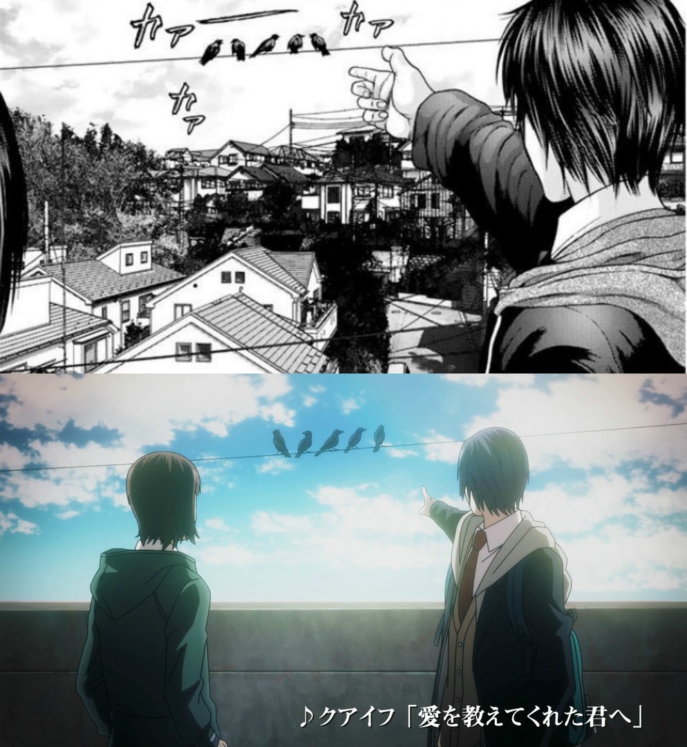 Различия адаптации с мангой минимальны. В большинстве своём отличия условны, например, различаются обстоятельства «обретения» домашнего питомца. В манге он не был случайной находкой, и, если судить объективно — новые обстоятельства смотрелись лучше, они были отчасти урезаны, но без ущерба для повествования. Адаптация последовательная, за первые два эпизода было экранизировано ровно 13 глав. Финальный не добрал несколько «ярких» сцен, но они настолько же влияли на сюжет, как мой поход за хлебом до магазина и обратно. Тут есть Трамп! Он даже скажет тираду слов, которые в адаптации возымели иной, «жизнеутверждающий» смысл, может, это к лучшему.