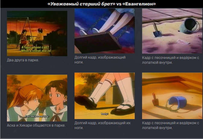 @RoundaboutNZRY@MTFcupa, там сцены покадрово взяты, о чем ты?@Mtf02@RoundaboutNZRY, как было и в самой Еве. Это называется отсылка, какие-то проблемы?@Romka_Beton,@RoundaboutNZRY@Mtf02, нет, это называется плагиат а не отсылка.@Mtf02@Romka_Beton, ну значит сама Ева воровала у таких аниме как "Уважаемый старший брат" и "Полиция будущего", беря сцены из этих тайтлов@Romka_Beton@Mtf02, значит - так@Mtf02, покадрово скопированная сцена не является отсылкой, а является плагиатом, лол. Ну расскажи конкретней места плагиата в еве, а я попробую согласится@Mtf02@RoundaboutNZRY, ну держи, клоун@RoundaboutNZRY@Mtf02, фу, ну ты и собака агрессивная. Такие кадры с ногами, лицами и разговорами можно найти где угодно. Ну про треугольник еще ок, че дальше-то
