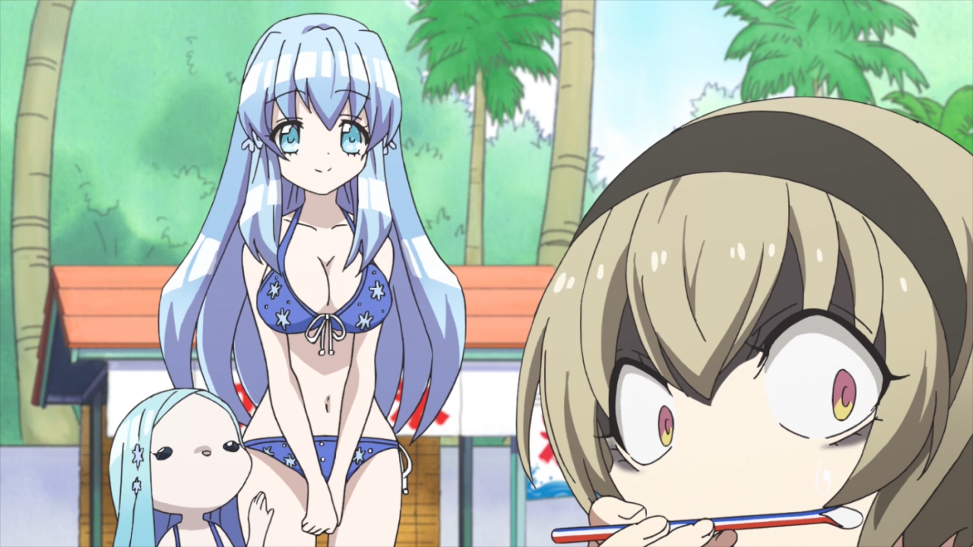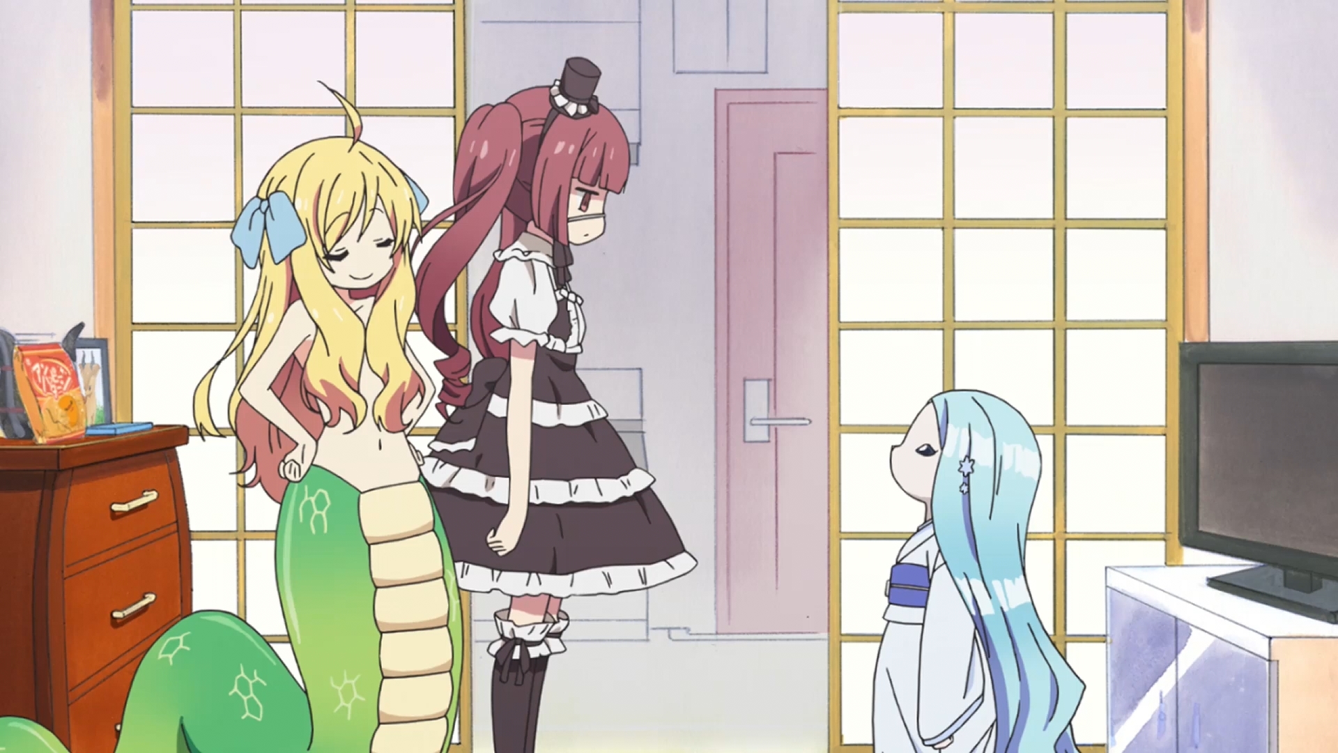 Мелькают время от времени и другие персонажи – айсмена, дочь пастыря, рогатая школоло и прочие существа, придуманные в пьяном угаре автором. Аниме чем-то схожее на Monster Musume no Iru NichijouПовседневная жизнь с девушкой-монстром, только без паренька в главной роли. Вообще женский серпентарий не прочь было бы разбавить мужскими существами, было бы смешнее, ситуация требует жертв, и они были бы у зрителя. Аниме благополучно использует убийства и расчленёнку, что явно плюс, но змеюка всё равно подыхает, это минус. Думаю, нечто подобное происходит в женской коммуналке с неуравновешенными личностями, особенно, если закрыть 4 психопатки в одной комнатушке. Будет вам и мафия в живую и ненависть на глубинном уровне. Хотя знаете, пожалуй, это всё же японская коммуналка, наша, она была бы более бисексуальной. Чем притягивает тайтл? В первую очередь сумасшествием, так шизоидно, что даже хорошо. Так тупо, что даже интересно. Девушки различны и умиляют своим садизмом и благочестивостью. Перед нами чистая комедия не разговорного жанра, а визуального, обычно связанного с извращением и получением сильных телесных повреждений.