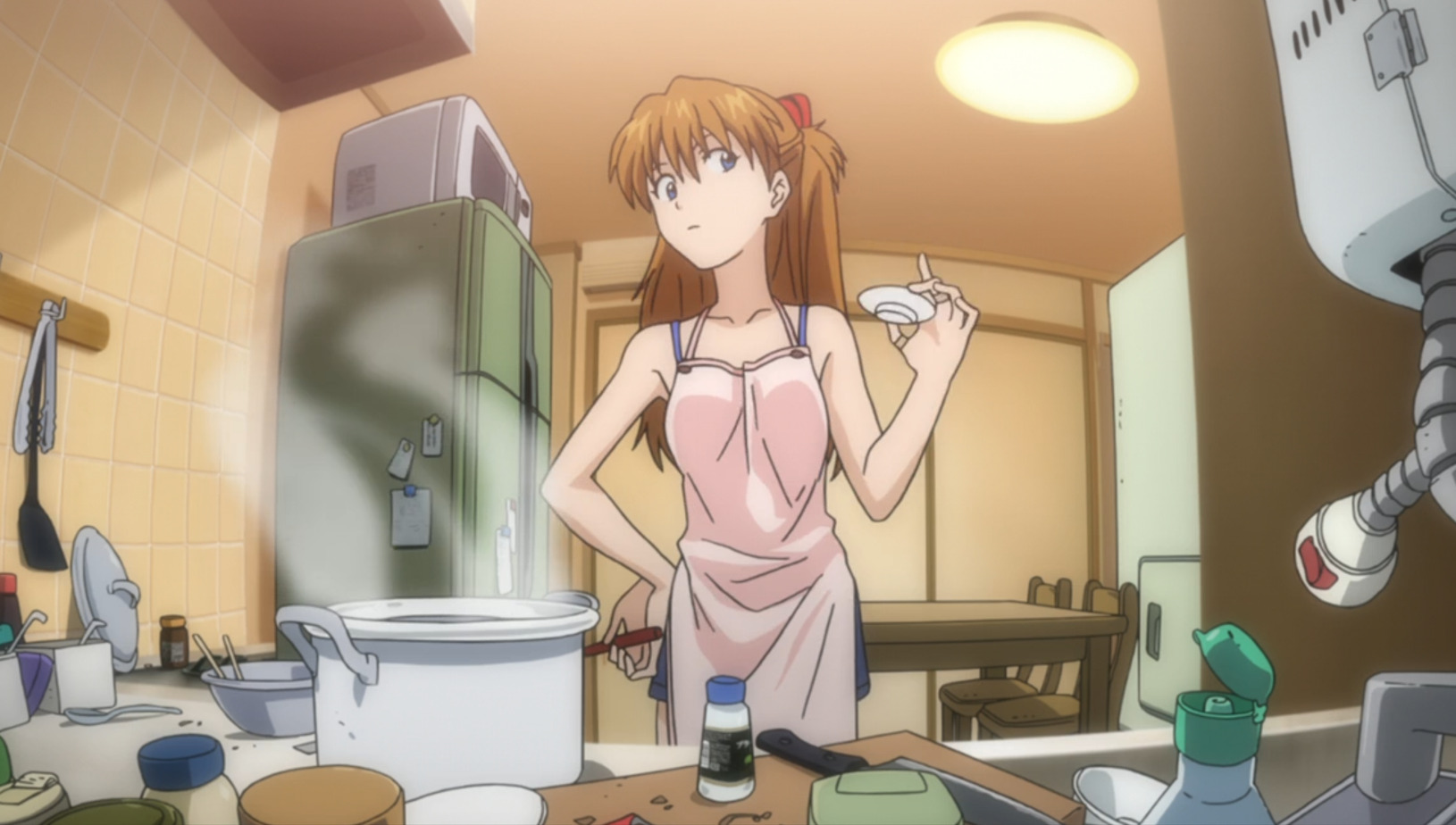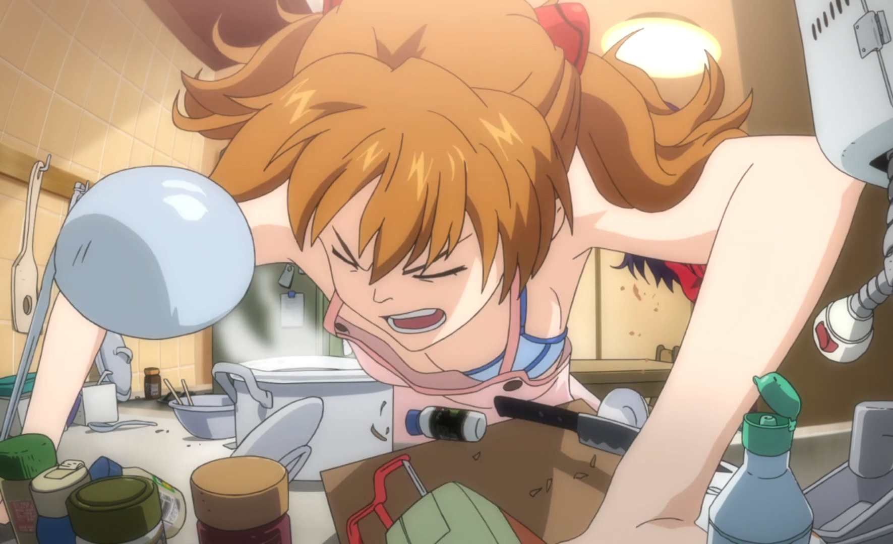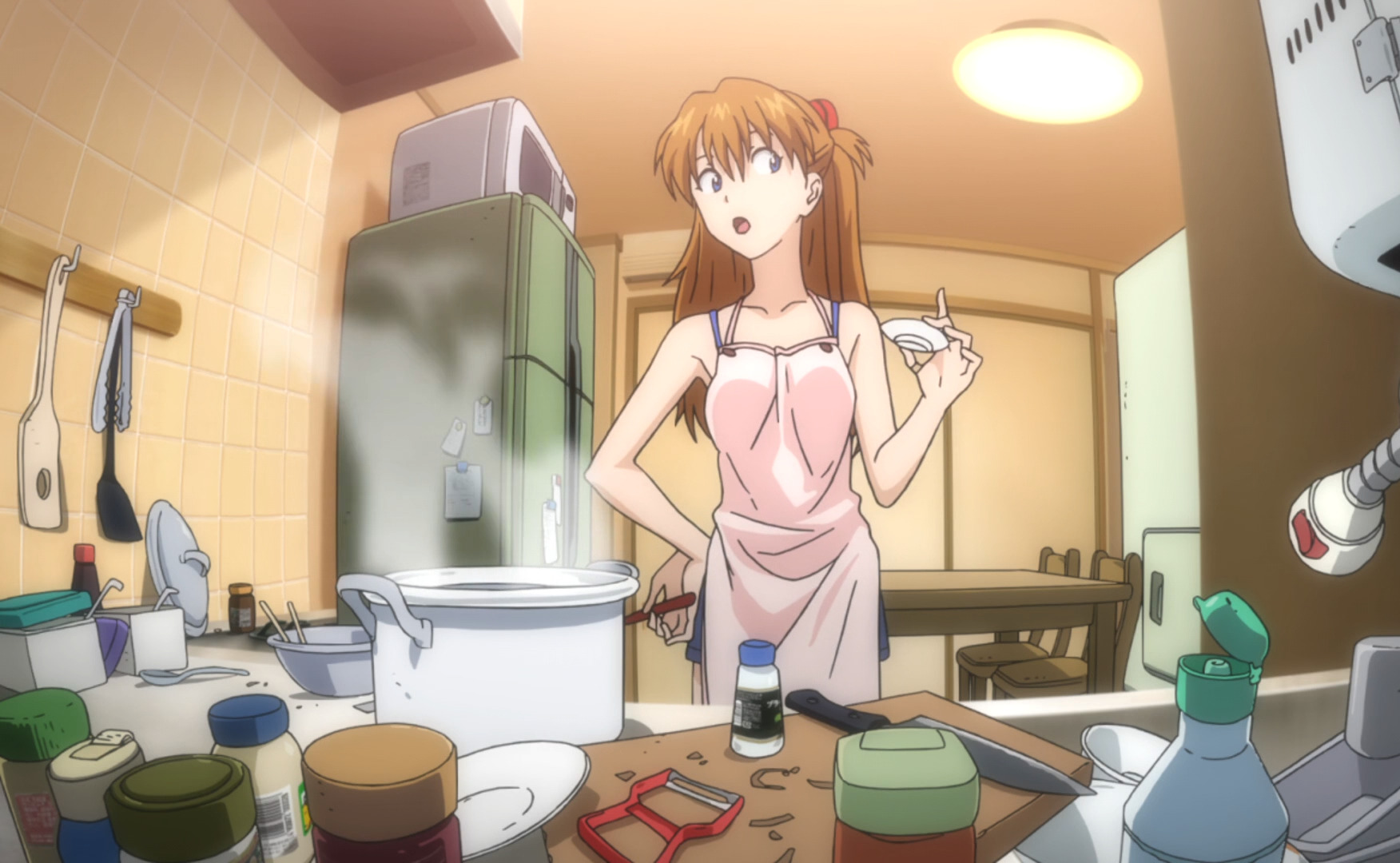 ●стало больше фансервиса. Трусы аски, мисато в майке, голая аска, облегающие костюмы, груди и т.п.(до сих пор забавляет, как мунлайтеро-дрочеры ругали франкс за излишний фансервис у костюмов пилотов, мол слишком сильно облегает, грудь видна, жопа торчит, но как иначе должен работать костюм пилота мехов.. забавные детишки, пусть ребилды евы глянут, тут точно так же. и нет, я не издеваюсь и не смеюсь, просто это нормальная одежда, которая часто встречается в этом жанре, почему франкс то только получает с этого?)