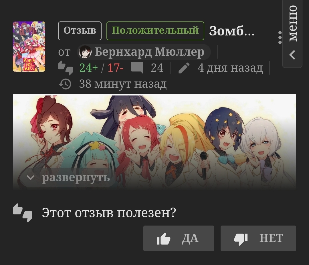 Зомбилэнд Сага - это пример того, что ты никогда не знаешь, что тебе может запасть в душу. В один день это может быть Илиада, во второй день какой-нибудь тупорылый этти комедийный сериал, в третий трагедия Еврипида, а в четвёртый - треш-комедия-драма про мёртвых айдолов, которые после смерти поют и танцуют. Как это работает, я не знаю, но так сложилось, что уже долгое время зомбидевочки оказывают на меня очень сильное влияние, и я честно говоря даже не знаю, почему. Может аниме само по себе классное, может мне просто музыка понравилась, может меня так сильно лайвы впечатлили, может всё вместе, фиг его знает. Но это один из немногих сериалов, которые я могу пересматривать постоянно и музыка из которого вылечивает меня вообще в любой ситуации, поэтому не оставить отзыв на это странное аниме это преступление.