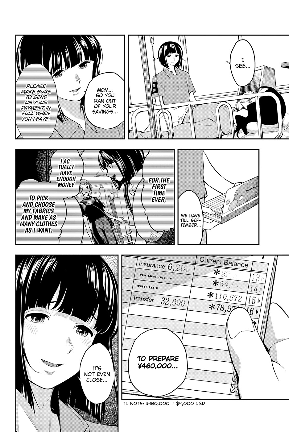 Возможно, что это не все деньги семьи Икуто, а только его заработок, и у сестер свои счета. Тогда выходит, что за 3 недели им нужно накопить еще около (340к - 40к - 40к) = 260к (берём примерно поровну на 2 сестры). Но они всё равно не успевают. Скорее всего у матери ещё есть накопления какие-то, про которые нам не говорят (сказали только то, что мать Икуто тратит сбережения мужа на лечение).