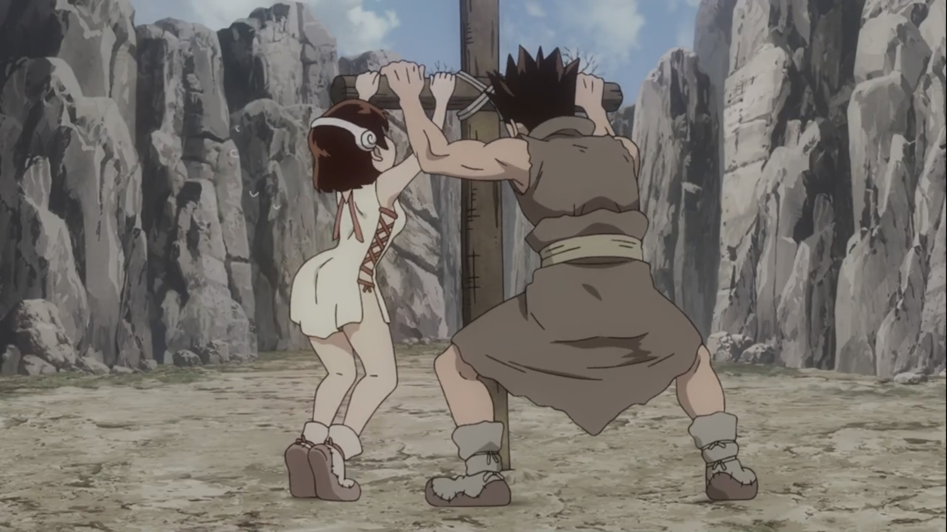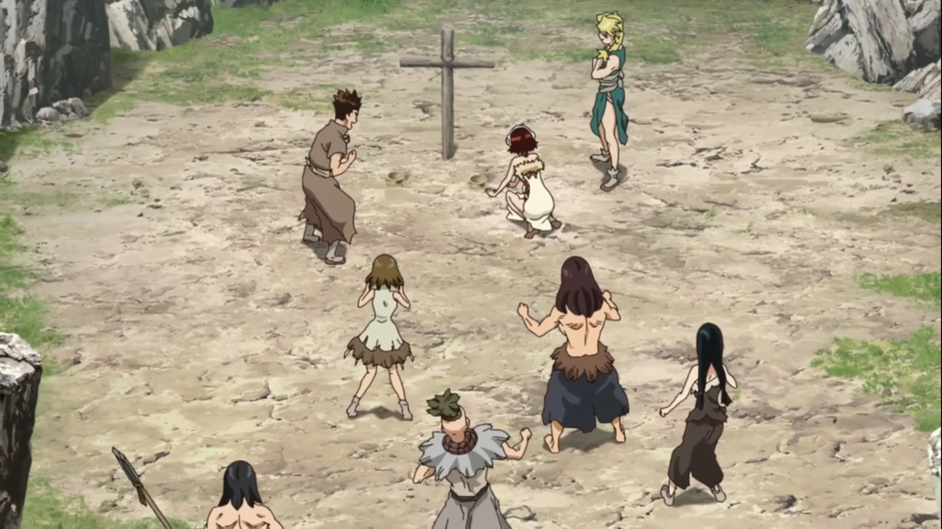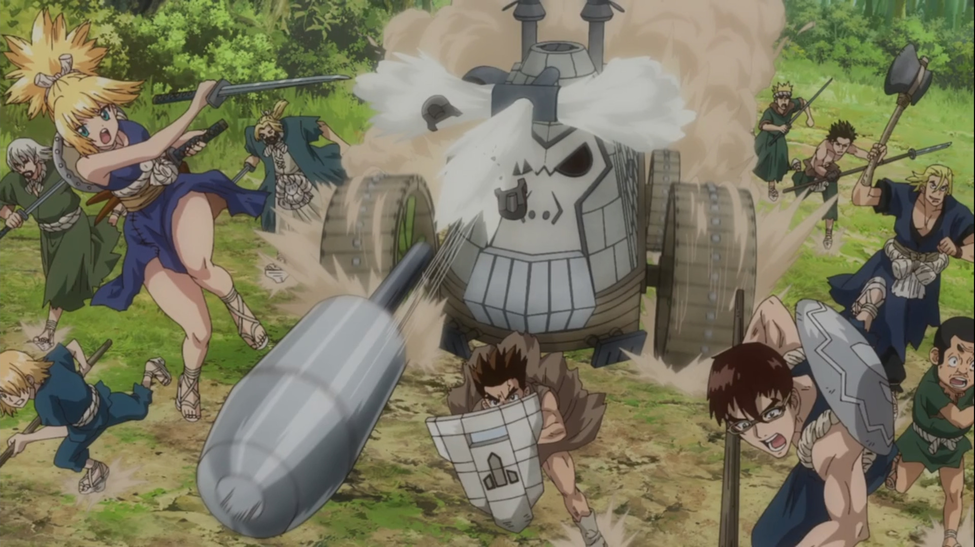 Научники описали грядущее сражение как битву на скорость, кто первый нападает – у того и больше шансов на победу. Но нельзя начинать войну без должной подготовки, верно? Первые серии посвящены как раз таки сборам, строительству и дистанционной агитации армии Цукасы в последователей Сенку. Последние серии же непосредственно, самим каменным войнам и прологу.