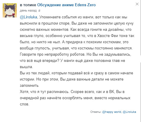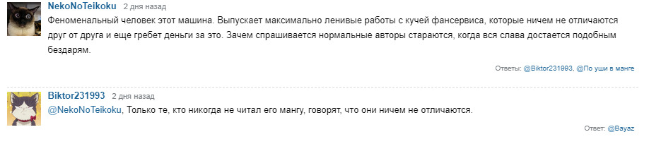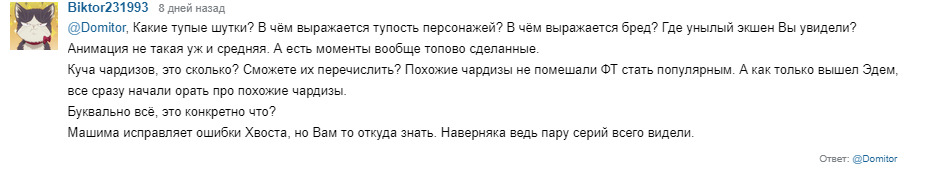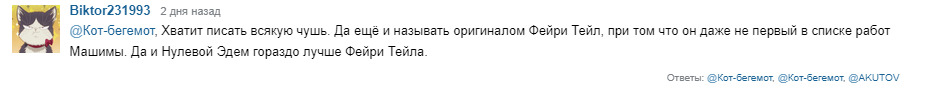 @Меняющий Лица, Машима, как и любой другой мангака, не имеет никакого влияния на адаптации, отсутствие крови в Фейри Фейле - вина производственного комитета. В манге кровь есть:@Меняющий Лица, Чую список фейковый у тебя@Меняющий Лица,@Biktor231993@По уши в манге,@Меняющий Лица, Ты не все отсылки нашел) их гораздо больше)))@Меняющий Лица@Kurimaru, я знаю,просто влом было все выкладывать@Меняющий Лица, По первой же строчке понятно, что это не отзыв, а глупый троллинг. Рэйв Мастер Вы не читали. Это понятно потому, что похожие дизайны Вы видите только у Хвоста Феи и Эдема, хотя некоторые дизайны пришли в Хвост Феи прямиком из Рэйва.У Шики от Грея только цвет волос, Ребекка тоже мало чем похожа на Люси. У Вайза есть прототип. И он очень легко угадывается. Но это не Стинг. Прототип Джастиса был ещё в одном из первых ваншотов Машимы, затем он появился в Рэйв Мастере, а уже потом в Хвосте Феи и Эдеме. То, что у Зигги и некроманта есть лицо-череп, не делает их похожими. Они абсолютно разные по дизайну. Характеры тоже отличаются.