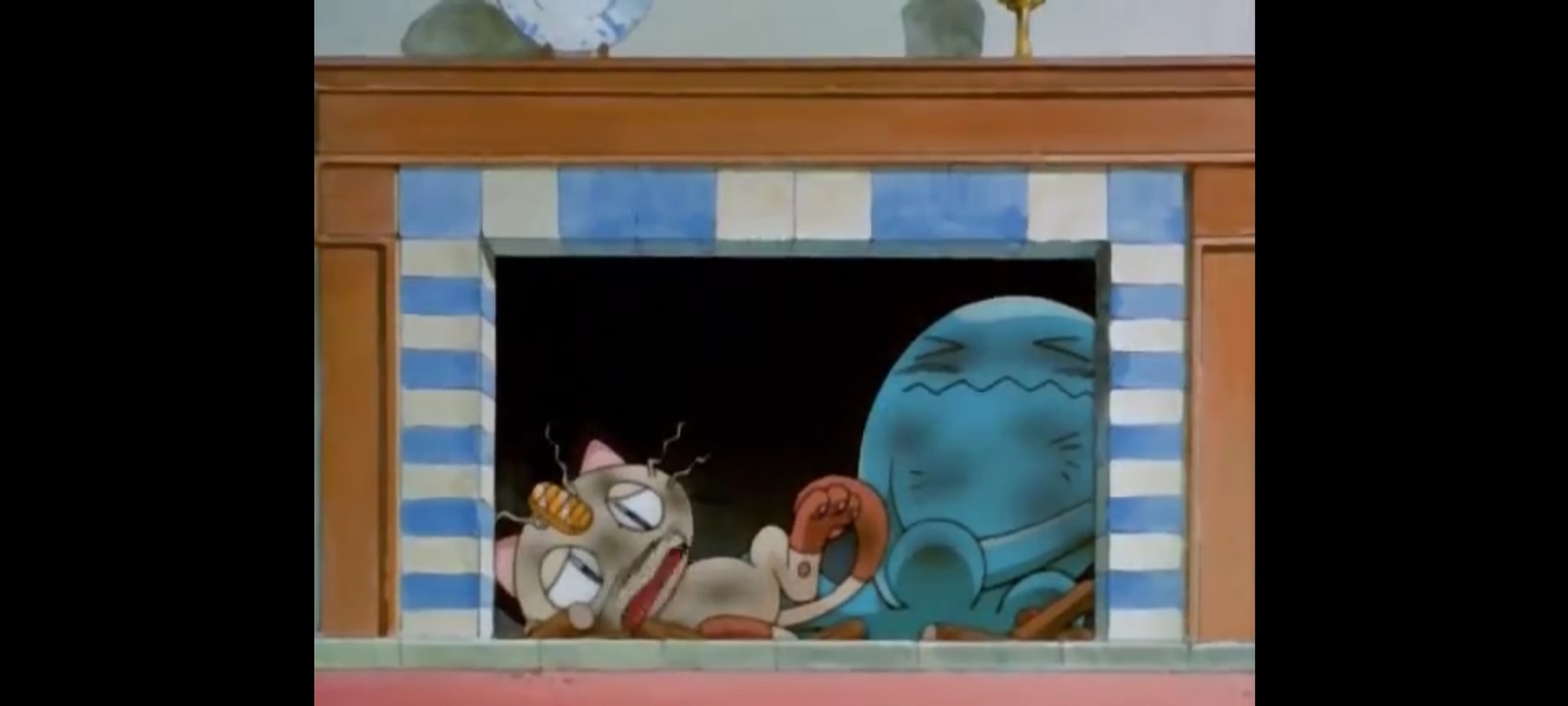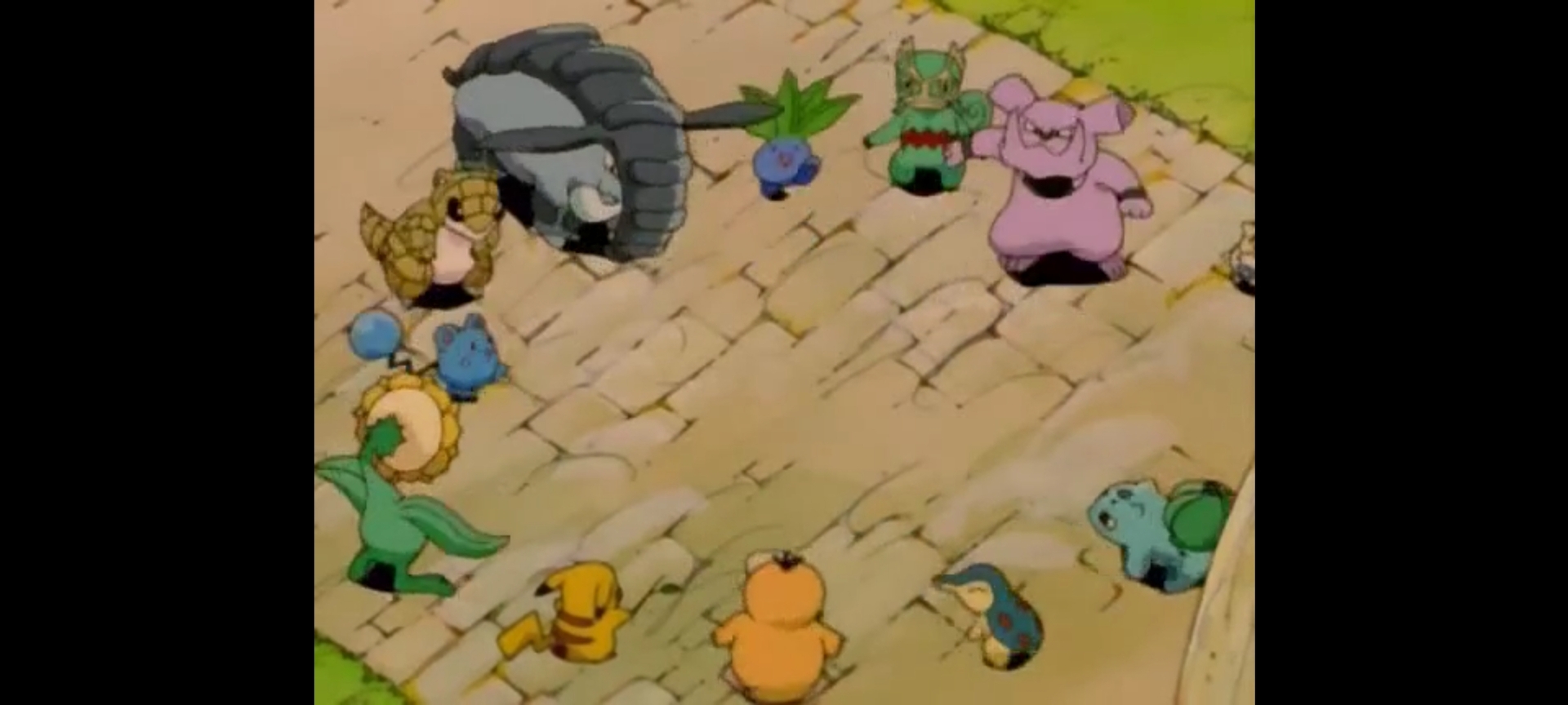 Но тут в кадре появляется здание, это театр покемонов, и покемоны тоже рядом с ним. Они приглашают компанию покемонов во главе с Пикачу поиграть в прятки