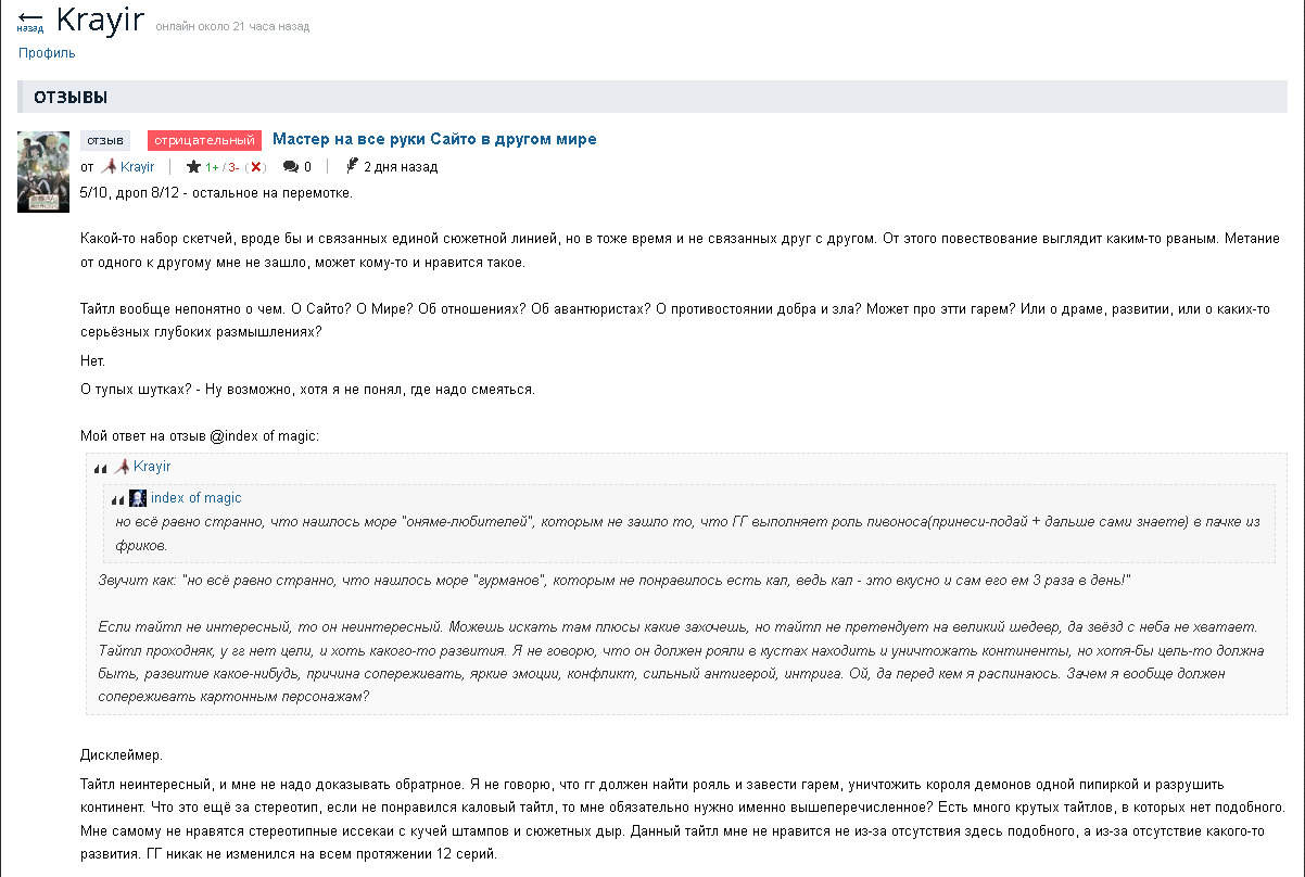 - "Есть много крутых тайтлов, в которых нет подобного. Мне самому не нравятся стереотипные иссекаи с кучей штампов и сюжетных дыр." - так озвучь эти самые "крутые" тайтлы в количестве нескольких штук, в чём проблема? А на счёт стереотипных исекаев с кучей штампов и сюжетных дыр - это уже весомый "дизлайк" получает от людей, которые смотрят тайтлы ради удовольствия и после пишут конструктивный отзыв.