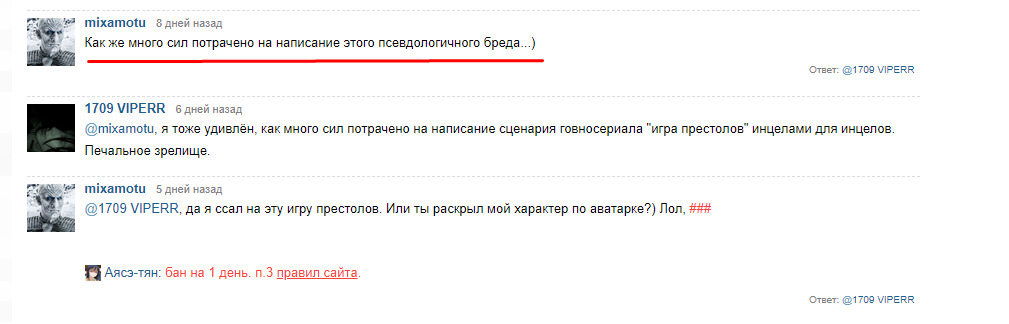 @nasilie@mixamotu, я тоже удивлён, как много сил потрачено на написание сценария говносериала "игра престолов" инцелами для инцелов. Печальное зрелище.@mixamotu@nasilie, да я ссал на эту игру престолов. Или ты раскрыл мой характер по аватарке?) Лол, ###@nasilie@mixamotu, а зачем мне раскрывать характер того, кто меня попросту не интересует?@mixamotu@nasilie, а зачем писать про игру престолов и вообще отвечать. А ответ, похоже, из разряда "могу всё, но не хочу". Браво за самооценку, тогда@nasilie@mixamotu, а зачем тогда писать, свое никому не нужное, ничем не подкрепленное - сопливое мнение фаната игры престолов? Не понимау логики, человек (не человек) приходит в комментарии, пишет про то, что отзыв плохой, не ссылаясь на отдельные моменты, не аргументируя свое манямнение, просто вбрасывает высер с "псевдолахичностью" и затем уже негодует, мол, пачему к нему так плоха относятся, словно к ихре престолав, ахазпзазахах))@nasilie@mixamotu,почему не отвечаешь тегом? что мешает мне понять, уровень твоего знания русского языка? мы как то друг друга не понимаем или в чем дело? представьте, человеку 43 года, он сюда заходит чиста чтобы свае мнение выразить в комментариях без аргументации, высер ради высера грубо говоря, не терпи пж
