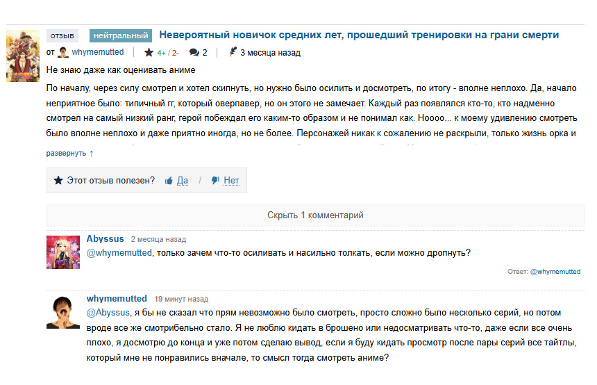 @whymemutted, только зачем что-то осиливать и насильно толкать, если можно дропнуть?@whymemutted@Abyssus, я бы не сказал что прям невозможно было смотреть, просто сложно было несколько серий, но потом вроде все же смотрибельно стало. Я не люблю кидать в брошено или недосматривать что-то, даже если все очень плохо, я досмотрю до конца и уже потом сделаю вывод, если я буду кидать просмотр после пары серий все тайтлы, который мне не понравились вначале, то смысл тогда смотреть аниме?@Redington@whymemutted, опа попался, несите моё@whymemutted@Redington,