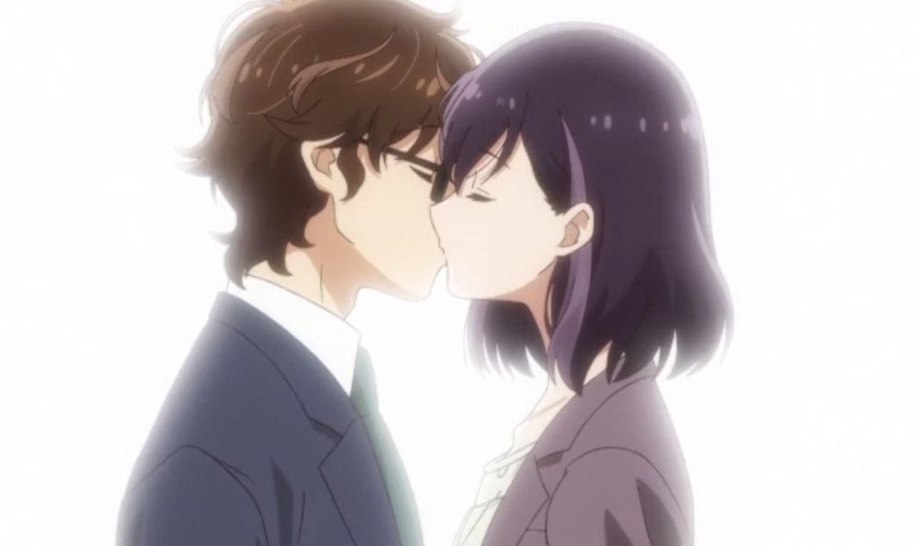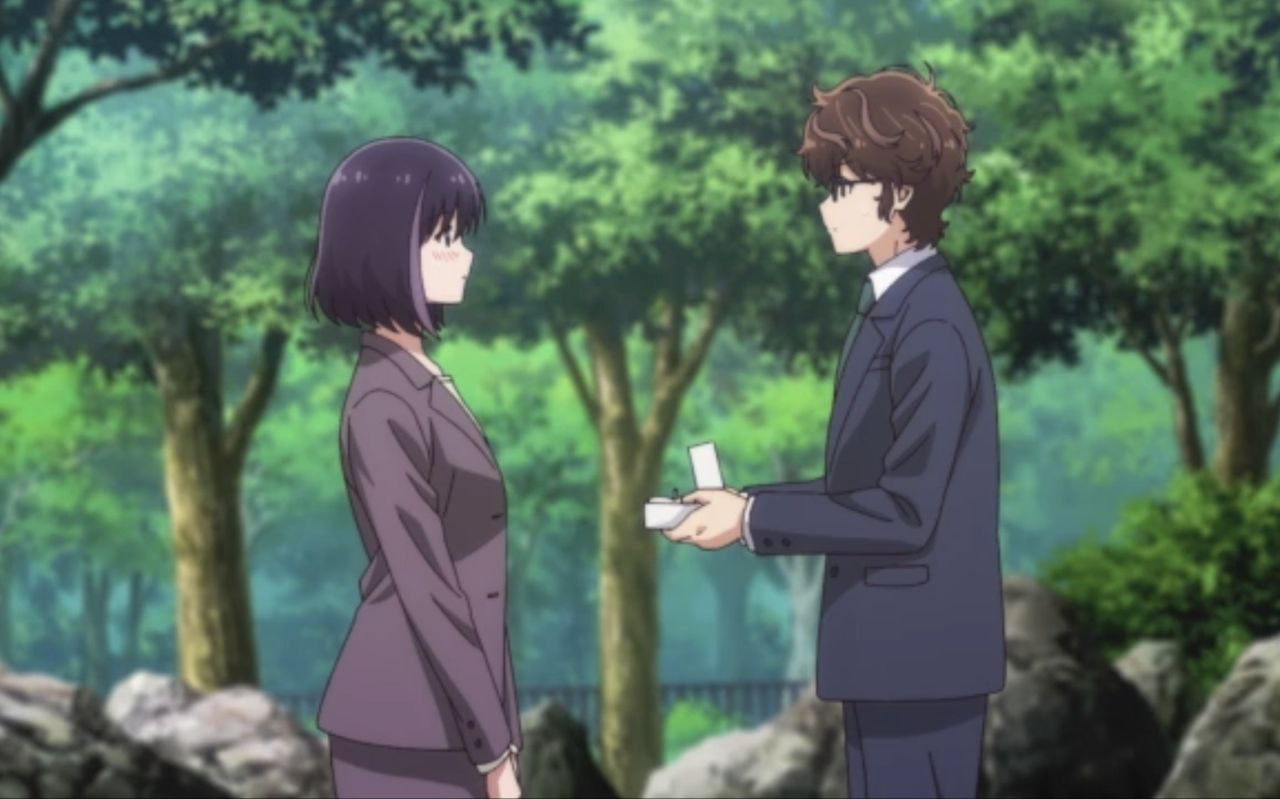 Общая частьОтношения начинаются с обмана, но уже с самого начала мы видим, что они наслаждаются обществом друг друга и их привязанность укрепляется.Темп повествования для меня идеален. А их романтические отношения развиваются, вполне реалистично: диалоги на протяжении всего аниме, были крайне искренними и чуткими к друг-другу, нет лишней драмы или недопонимания ради того, чтобы сделать, авось прокатит — всё, что происходит, является прямым следствием действий и решений персонажей, что делает связь между героями ещё более ценной. Моментами, казалось, что общение чересчур — формальное, а их времяпровождение (например, свидание) кажется порой — заданием (но...специфику работы не забываем)? Стоить помнить, что эмоциональный опыт у них нулевой, да они взрослые, но строят отношения впервые, отчего всё происходит крайне неловко. Ни один из них не является экспертом в свиданиях, и, очевидно, они не могут рассчитывать на помощь своих друзей или коллег (ну тут без объяснений). Это задаёт основной тон каждой серии, в которой они пытаются как можно лучше справиться со своей ситуацией. Ведь у нас с Вами тот самый случай: «Я притворюсь, что вышла/ел замуж, но не могу подавить своих чувств! Что же делать!» Вполне логичное развитие действий, хотя не без странностей (работают вместе уже 4 года). А что мешало Вам раньше познакомиться? Но я как писал, иногда требуется — вмешательство свыше, чтобы что-то продвинулось вперёд, порой мало понимать и судить человека, а нужно побыть в его собственной шкуре. В общем с каждой серией нарастают чувства, которые перерастают во что-то большее и приводят нас к конечной точке — любви! А любовь и брак... что-то близкое, прекрасное, но иногда настолько далёкое (разное)...