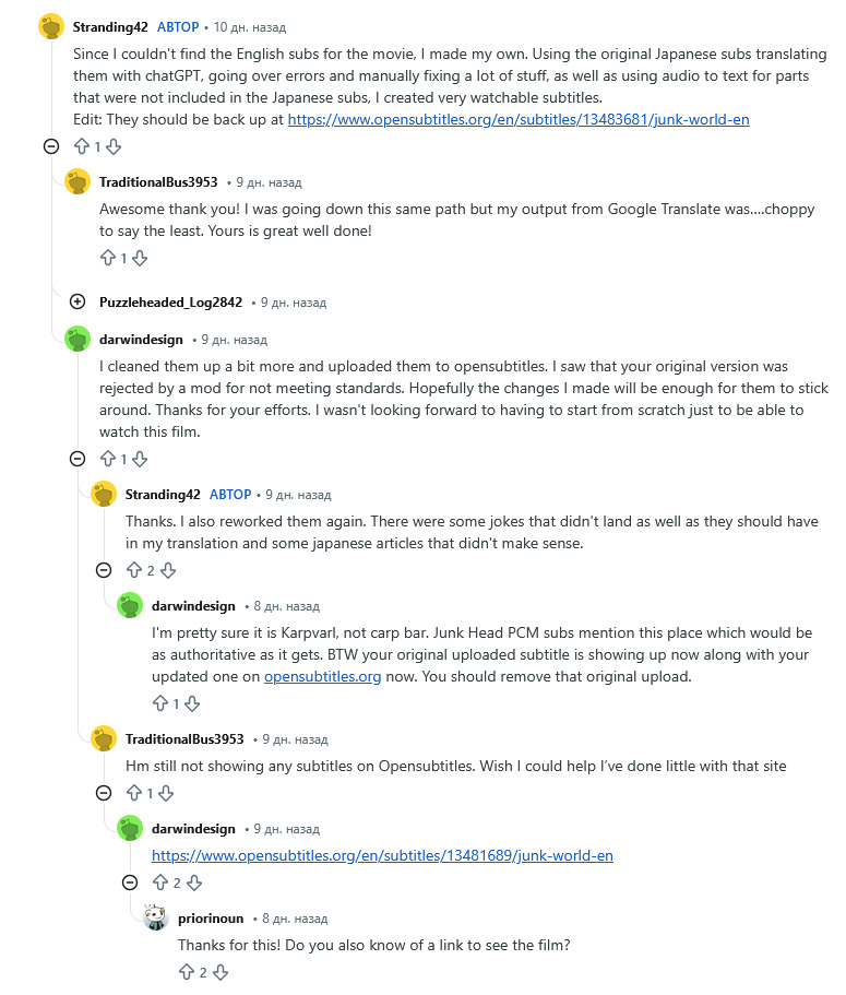 @AdskiySotona, Русских сабов нет, а уж тем более озвучки. Прошлую часть лицензировали, не знаю как будет с этой, но я находил английские сабы в формате .srt (по сути текстовый файл с временными метками). Его можно скормить какой-нибудь LLM и попросить перевести на крайняк.@Yonker@4rtu9o, такое уже запилили www.opensubtitles.org/en/subtitles/13481689/junk-world-enP.S. И да, тут есть отсылка на Кин-дза-дза.
