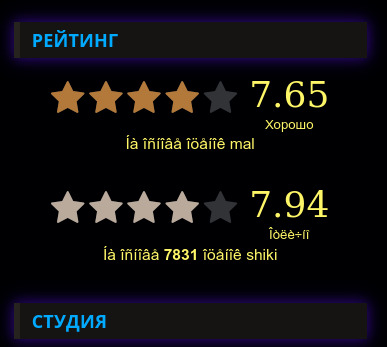 кстати на шики оценка почти 8 (не обращай внимание на крякозябры, скрипт повредился чутка при переносе, еще не исправил). Еще моралфаги с МАЛа откуда шики отображает оценки (и игнорирует голосование местное) - тоже влияют на то что ты видишь.