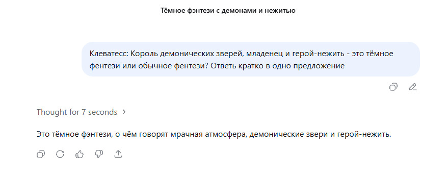 @Userpereuser@Uanyka69, а меня бесят люди, которые вместо своего аргументированного мнения кидают мне ответ иишки. Мрачная атмосфера, демонические звери, нежить, некромантия и разрушительное мировоззрение могут быть в любом фэнтези. Первая и главная особенность любого тёмного фэнтези это мир победившего зла, как события в Берсерке после Затмения или свободно охотившиеся на людей йома, которых искусственно вывели для создания оружия в Клейморе.