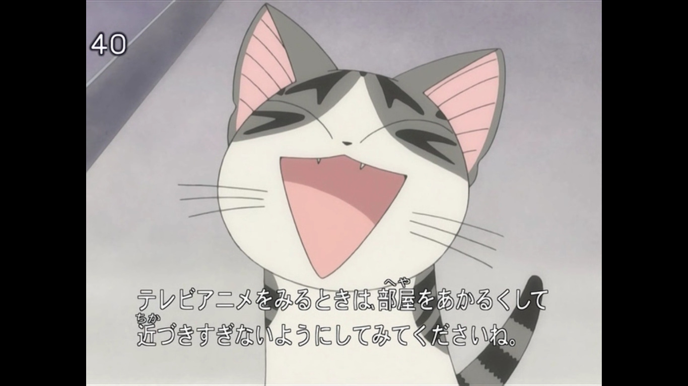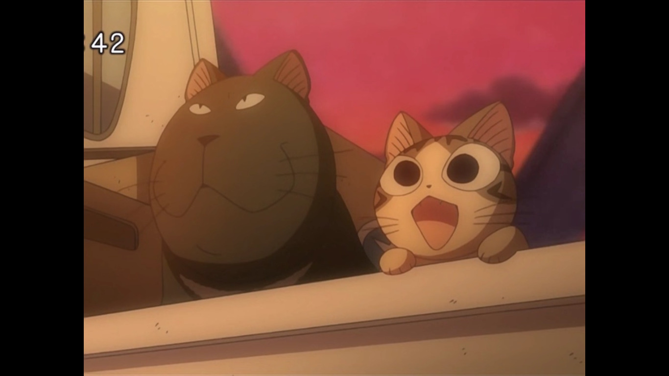 На этом моменте тоже есть одно интересное замечание. Здесь для зрителя открывается дихотомия двух парадигм - мировоззрение уличной и домашней кошки. Здоровенный чёрный кот представляет собой первую точку зрения, это мир дикой природы, конкуренции за территорию, естественного отбора и настоящей кошачьей независимости, Напротив здоровяка стоит Алиса, абсолютно вылизанная и по-своему высокомерная, привыкшая к определённому уровню потребления и очень редко вылезающая за пределы хозяйской ограды. Сначала Чи была ближе к Алисе, абсолютно домашний котёнок, который ничего в своей жизни не видел кроме квартиры Ямада, а впоследствии, когда ей уже разрешают вовсю шастать по округе, Чи по данному континууму перемещается к здоровенному чёрному коту, заняв золотую середину. Ведь, с одной стороны, у Чи появилось много знакомств и приключений, во втором сезоне её ойкумена сумела расшириться до размеров города, но при этом связь Чи с домом и семьёй только укрепилась. В итоге все стали членами её семьи. Она по-настоящему счастлива.