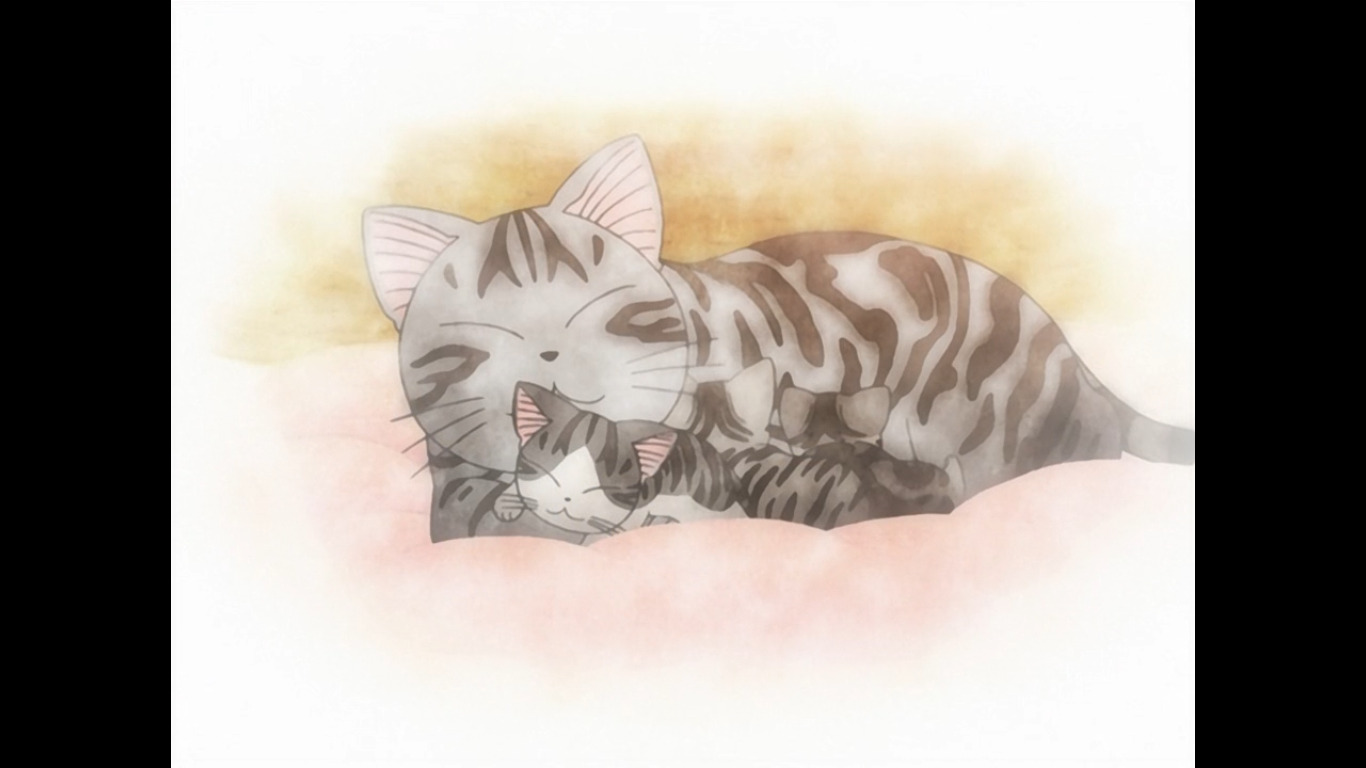 Интересно, кстати, как скоро Чи стала забывать о своём уличном происхождении, в первом сезоне она некоторое время скучала по матери и пыталась её найти, а затем вовсе перестала о ней что-либо вспоминать. В этом есть попытка изобразить происходящую в котёнке психологическую адаптацию, которая запечатывает для неё сначала травматическое событие потери, когда Чии осталась сиротой, а затем абсолютно любое воспоминание о прошлой жизни, которое непременно приведут её всё к той же травме. Тем более, Чи вскоре обрела в семье Ямада новых членов семьи: Кэнто и Мива стали ей родителями, а Йохэй братом. Дошло до того, что Чии, с большим удивлением для здоровенного чёрного кота, не признаёт себя его сородичем, потому что Чи это Чи. То есть настолько сильно психика Чи отгородилась от травмирующего прошлого, что больше ассоциирует себя с человеческой семьёй Ямада, где она, по сути, воспитывается.