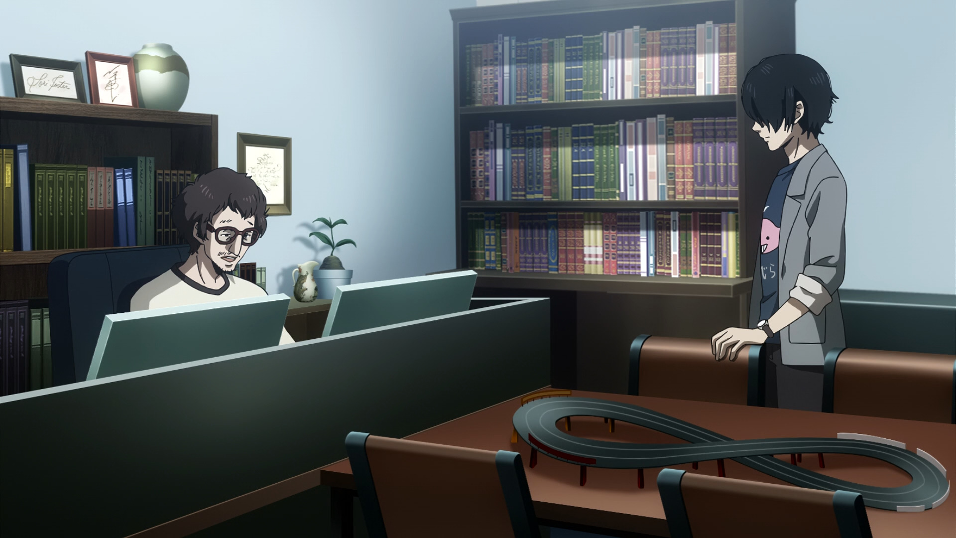 Если говорить подробнее о персонажах, то Сохэй — стереотипный отстранённый интеллектуал, гений, которого никто не понял, но ему это и не нужно. Моэ — странноватая девушка, влюблённая в Сохэя. Гением я бы её не назвал, но мышление у неё действительно нестандартное. Как женский персонаж в аниме она довольно необычна. И меня жутко отталкивало их взаимодействие. Я понимаю, что такие отношения типичны как для Мори, так и для Асано, но мне они показались неестественными. Это не то чтобы кринж, но определённо что-то «странное».