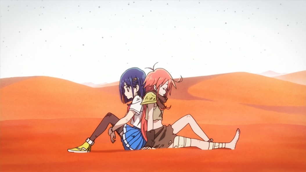 Первая половина Flip Flappers – всевозможные приключения, благодаря разнообразию декораций и настроению умело жонглирующая особенностями различных жанров – от комедий и боевиков до киберпанка и хорроров. Каждый эпизод показывает новый мир, так что, включая очередную серию, готовьтесь к свежести ощущений, какая чувствуется при начале нового тайтла.