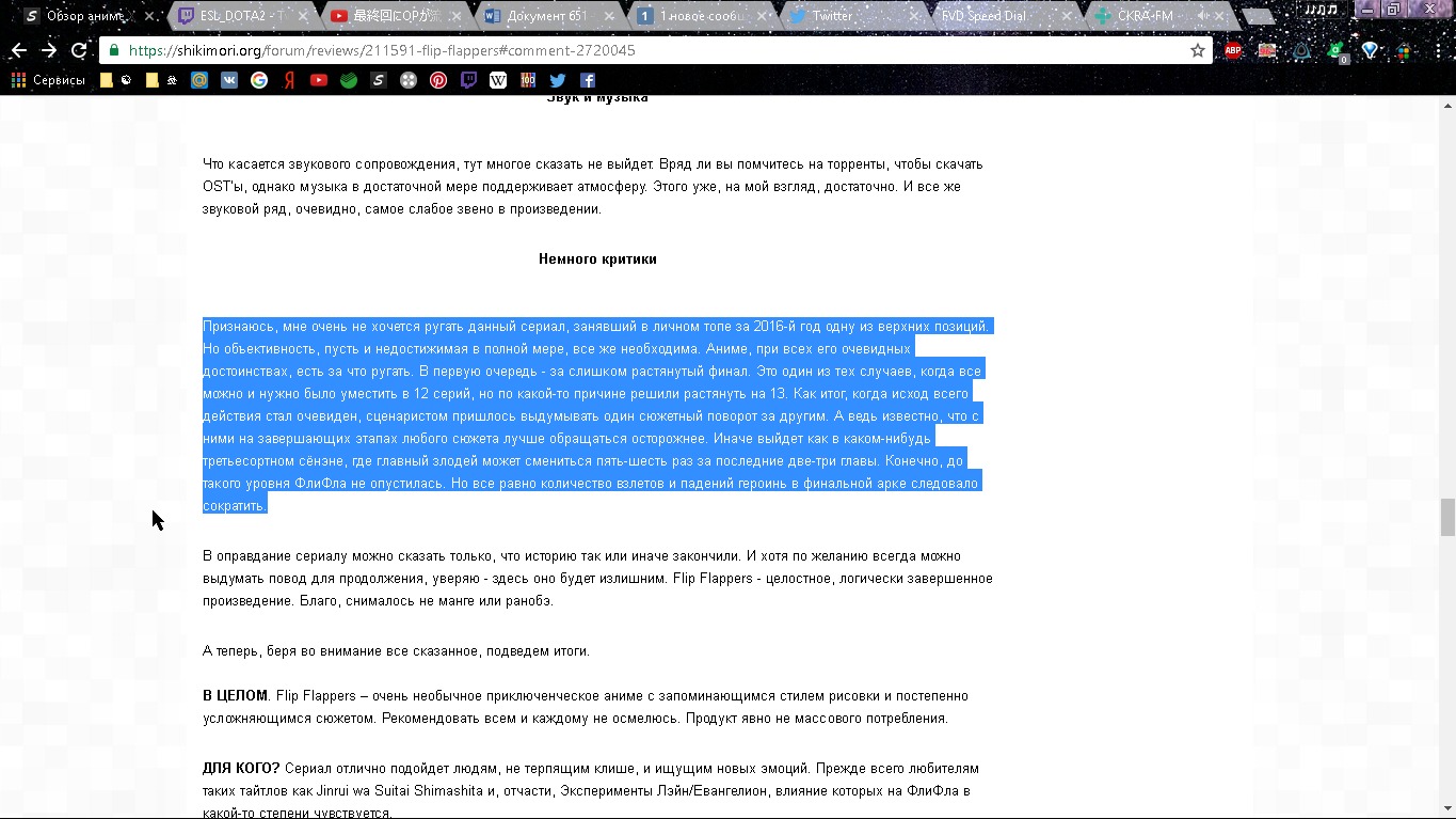 Признаюсь, мне очень не хочется ругать данный сериал, занявший в личном топе за 2016-й год одну из верхних позиций. Но объективность, пусть и недостижимая в полной мере, все же необходима. Аниме, при всех его очевидных достоинствах, есть за что ругать. В первую очередь - за слишком растянутый финал. Это один из тех случаев, когда все можно и нужно было уместить в 12 серий, но по какой-то причине решили растянуть на 13. Как итог, когда исход всего действия стал очевиден, сценаристом пришлось выдумывать один сюжетный поворот за другим. А ведь известно, что с ними на завершающих этапах любого сюжета лучше обращаться осторожнее. Иначе выйдет как в каком-нибудь третьесортном сёнэне, где главный злодей может смениться пять-шесть раз за последние две-три главы. Конечно, до такого уровня ФлиФла не опустилась. Но все равно количество взлетов и падений героинь в финальной арке следовало сократить.
