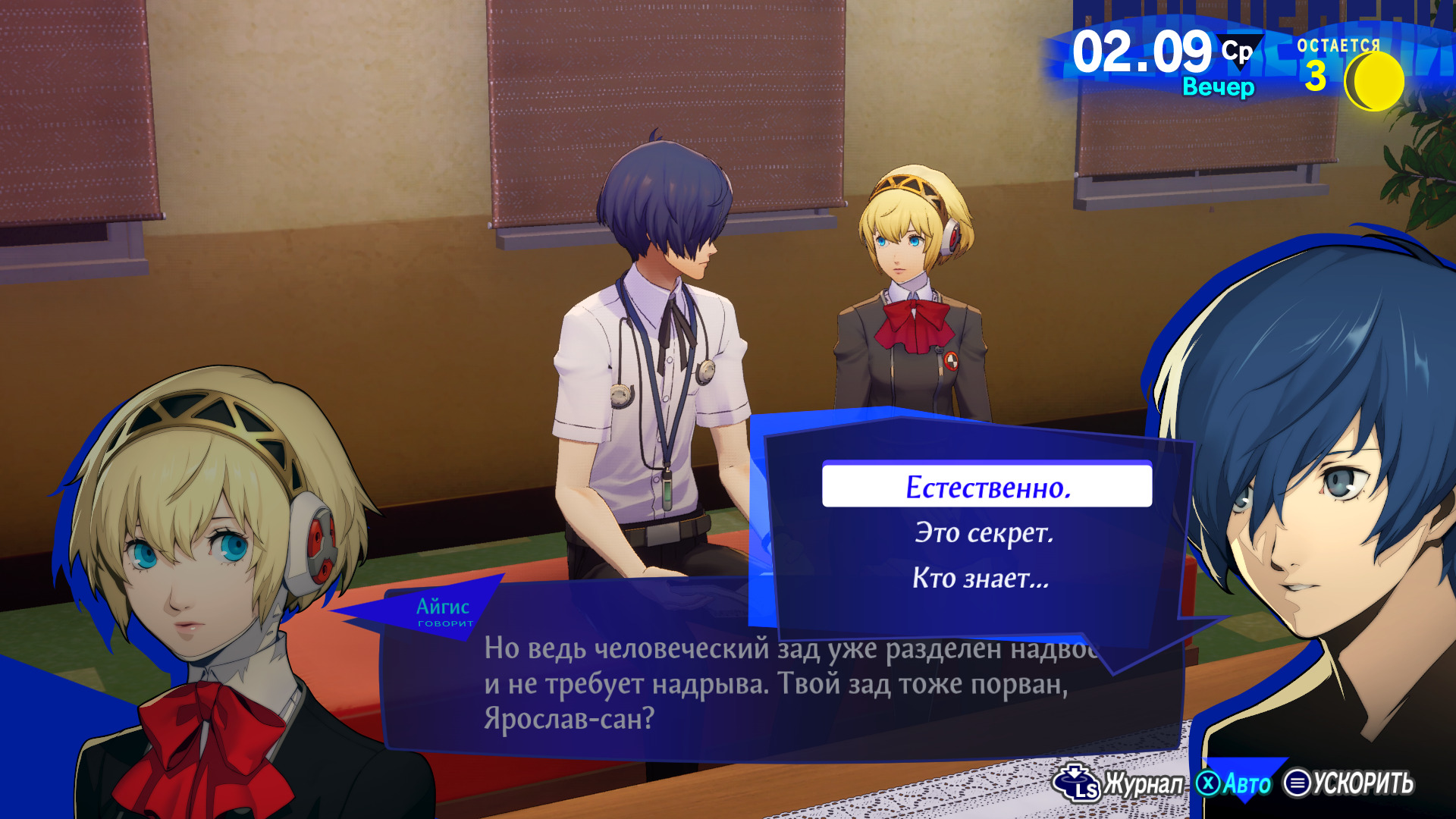 Ну и лучшая девочка этой игры - Айгис. И, к сожалению, понял я это аж на финальной катсцене. Ну, с ней вообще нехорошо поступили. Часть сюжета она бревно и генератор хохм, а раскрывается под конец сюжета, когда уже все персонажи раскрыты и ты, как игрок, выбрал свою вайфу. Будучи живой машиной для уничтожения теней, она рефлексирует на темы жизни и её смысла. Может ли робот быть человеком и что делает человека, простите за тавтологию, человеком. С арканами у Айгис необычная ситуация. Их 2 (ну, по факту 3, но третья уже после сюжета, забыли). Первый - , олицетворение войны, победы, контроля и уверенности в себе. Этот аркан главенствует первую часть сюжета, когда Айгис отыгрывает бревно. Она существует для уничтожения теней и не примет ничего, кроме победы, что и отражается в её аркане. После переломного момента, когда она начинает рефлексировать, её главенствующий аркан меняется на . Этот аркан находится в колоде Тота Алистера Кроули и означает попытки понять себя и весь мир. Персона у Айгис - . Это статуя-оберег, которая изображавшую Палладу. По легенде эта статуя хранилась в Трое и, пока она была там, Троя была неприступной. После эволюции Айгис получила новую персону - , которая была богиней мудрости, военной стратегии и тактики. Одна из историй рассказывает, как Афина в порыве ярости превратила волосы Медузы в змей и, не удовлетворившись результатом, приказала Персею убить её. А затем, как говорят, поместила голову Медузы в Эгиду, чтобы сделать её ещё более могущественной. И тут ещё надо рассказать про имя. Айгис (Эгида) - мифическая накидка Зевса, которая имела магические защитные свойства. (И, как вы могли понять, её можно романсить).