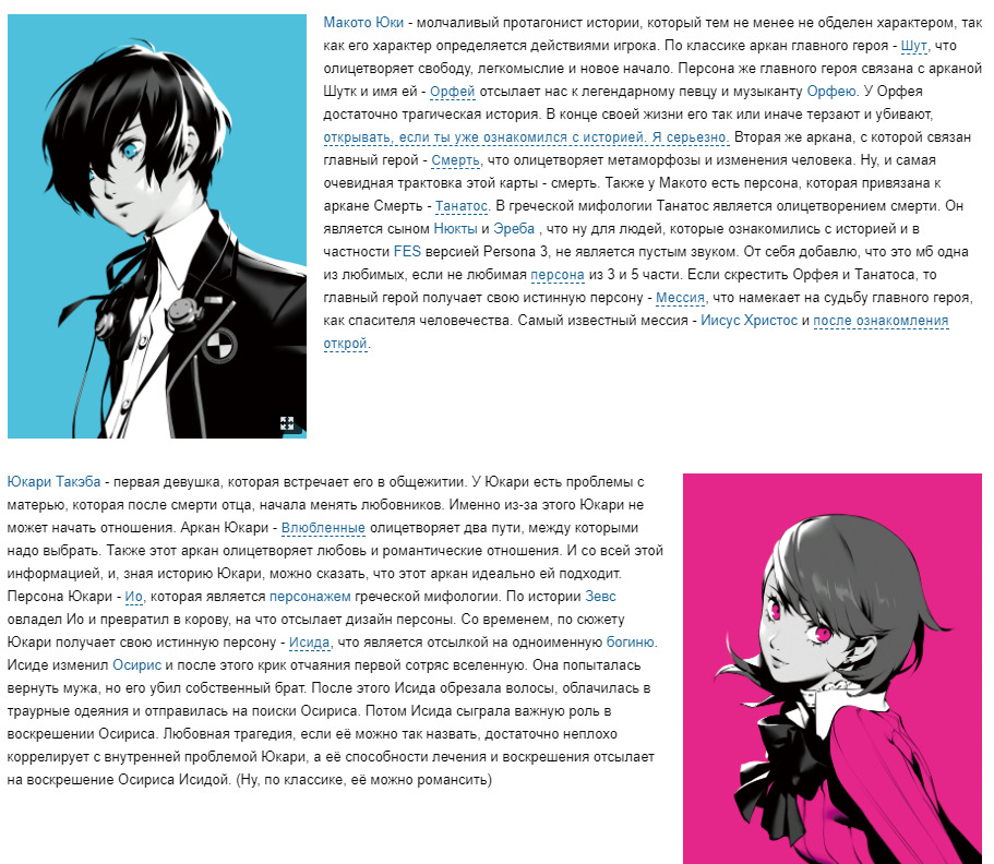 Я всё ещё убежден, что главное в Parsona - это герои. Ты с ними проходишь через огонь и воду. Ты, как игрок, в счастливые моменты радуешься с ними, в грустные - поддерживаете друг друга и тем самым привязываешься к ним. Это самый сок 5 и 3 части персоны (только с этими я пока ознакомился). В них находится весь символизм, отсылки и философия произведения. И, когда я начал рыться с в вики и разных статьях, а потом приступил к разбору персонажей, я нашел некую закономерность. Во-первых, многое, что связанно с картами таро, которые привязаны к персонажам, будет повторяться, но различия тоже есть. К примеру, одной из ключевых тем Persona 5 - были маски персонажей, которые им навязало общество и\или они сами. И, когда в рецензии на 5 часть, я намеренно упустил пробуждение истинных персон героев(я решил, что всё-таки надо это исправить), то тут я уделю внимание этому, так как тот же аспект с масками тут не присутствует и ему не надо уделять внимание.