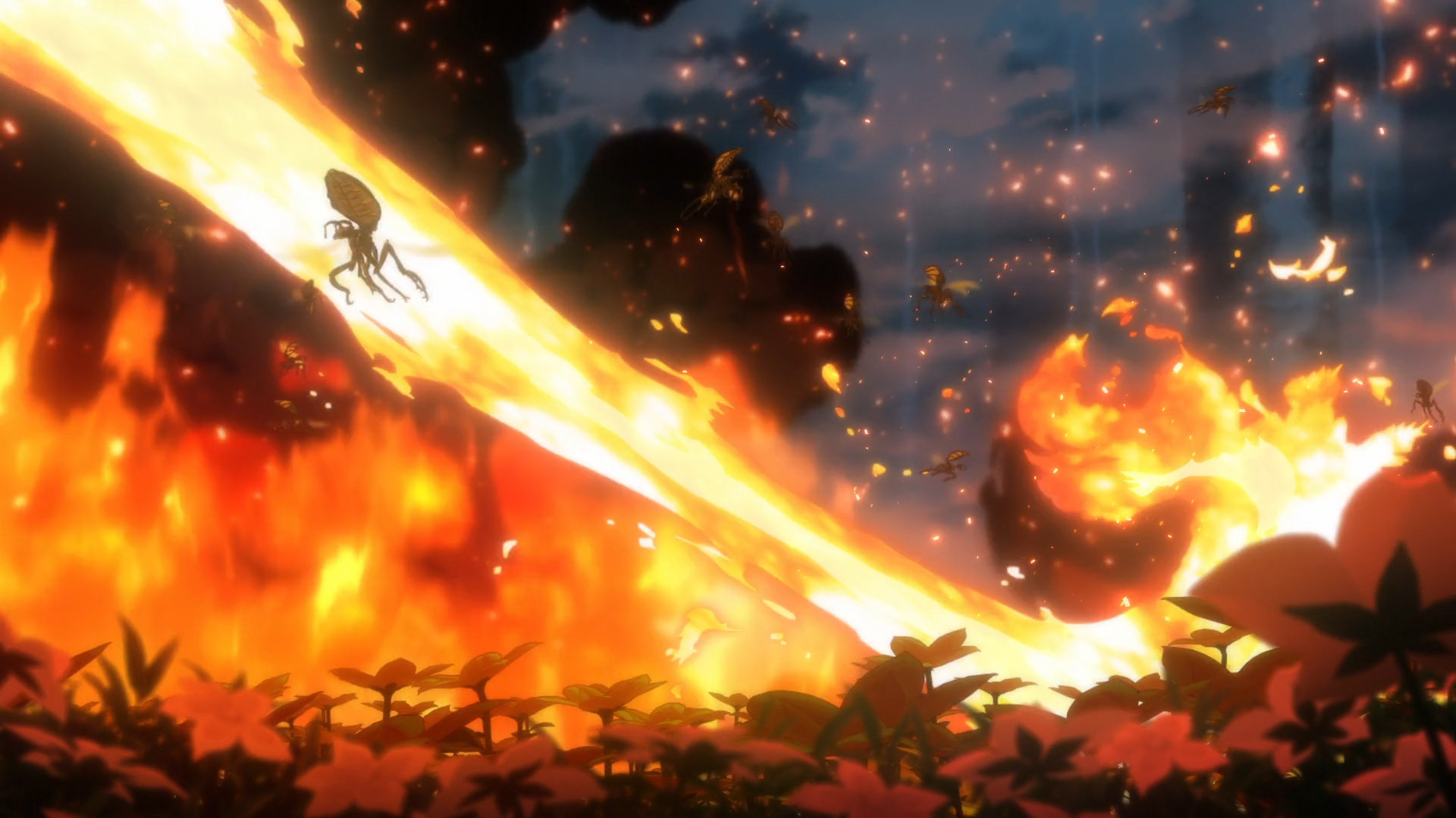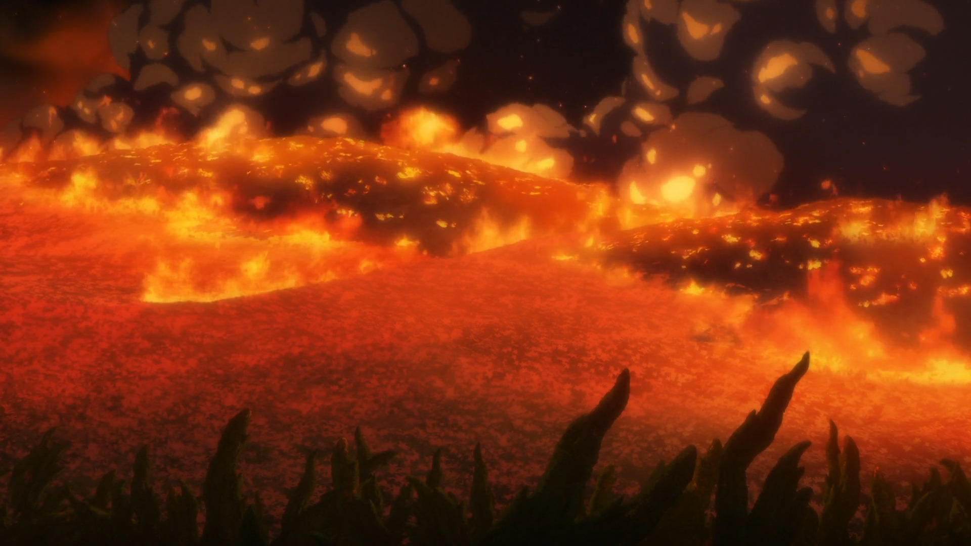 Языки бушующего пламени погружают ранее прекрасный пейзаж в неукротимы хаос, что накрывается пеленой толстого клубящегося дыма.