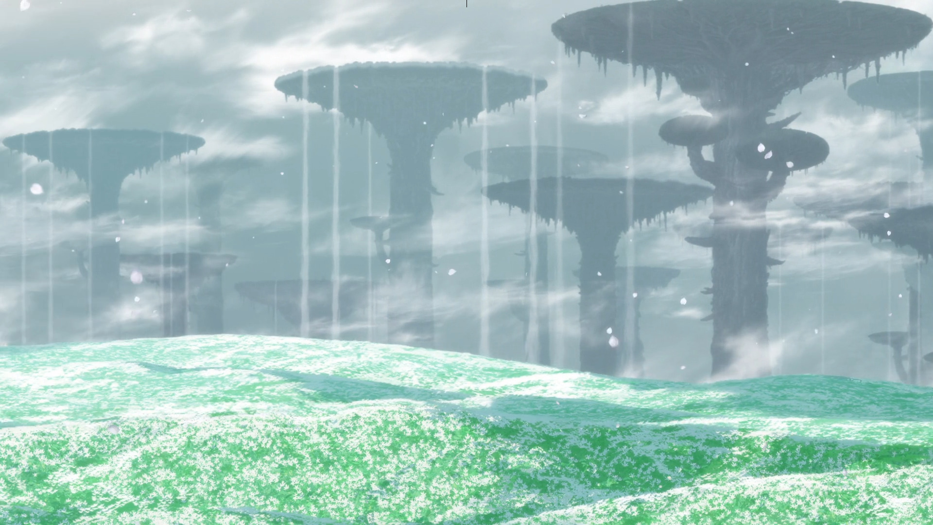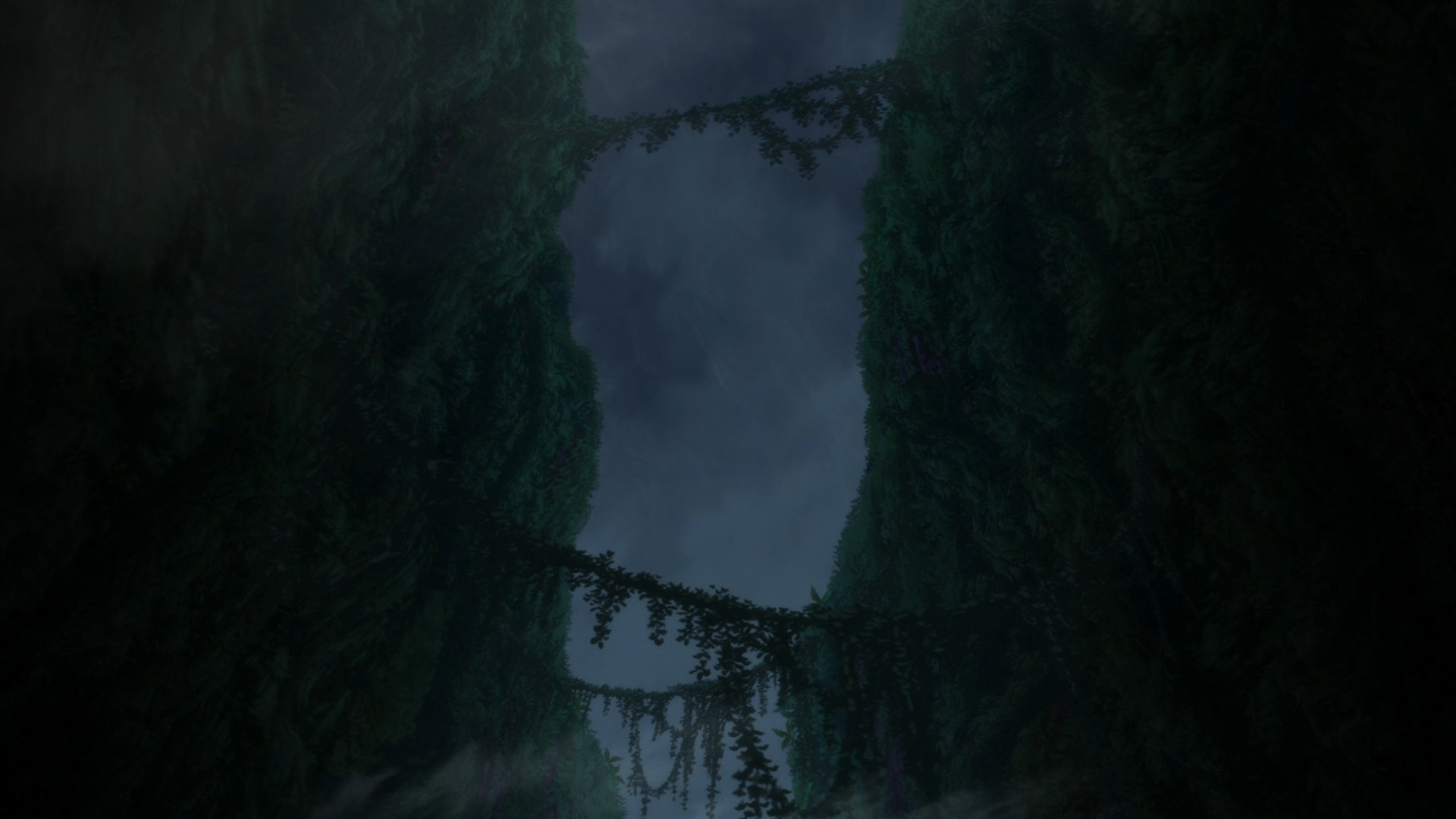 Начнём, пожалуй, с пейзажей четвёртого слоя, которые прекрасно открывают полный метр. Густой туман, окутывающий массивные стволы чаш великанов, сменяется сумрачными видами оснований гигантских растений, которые обросли кристаллами и заселились мелкими светящимися жучками.