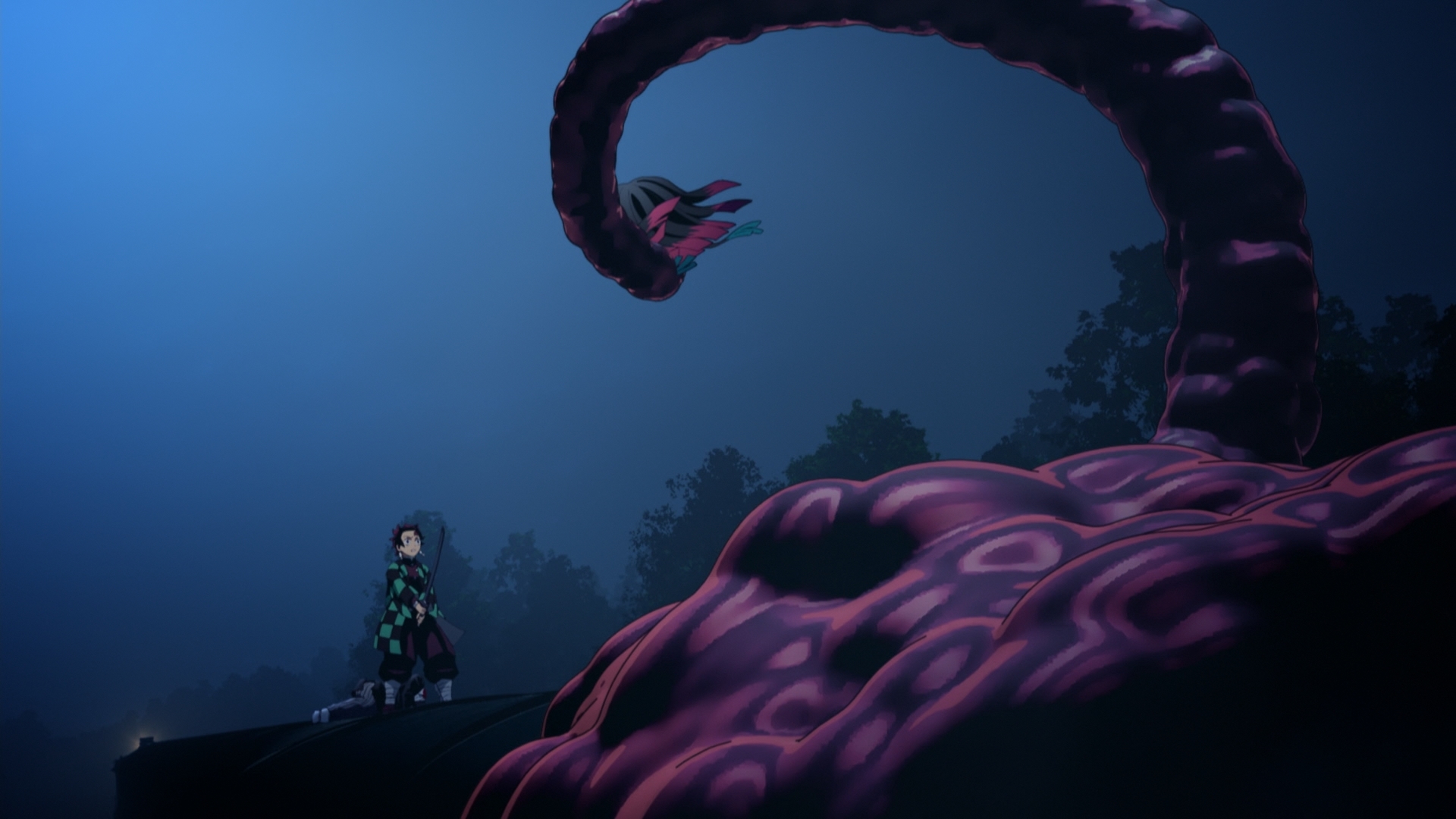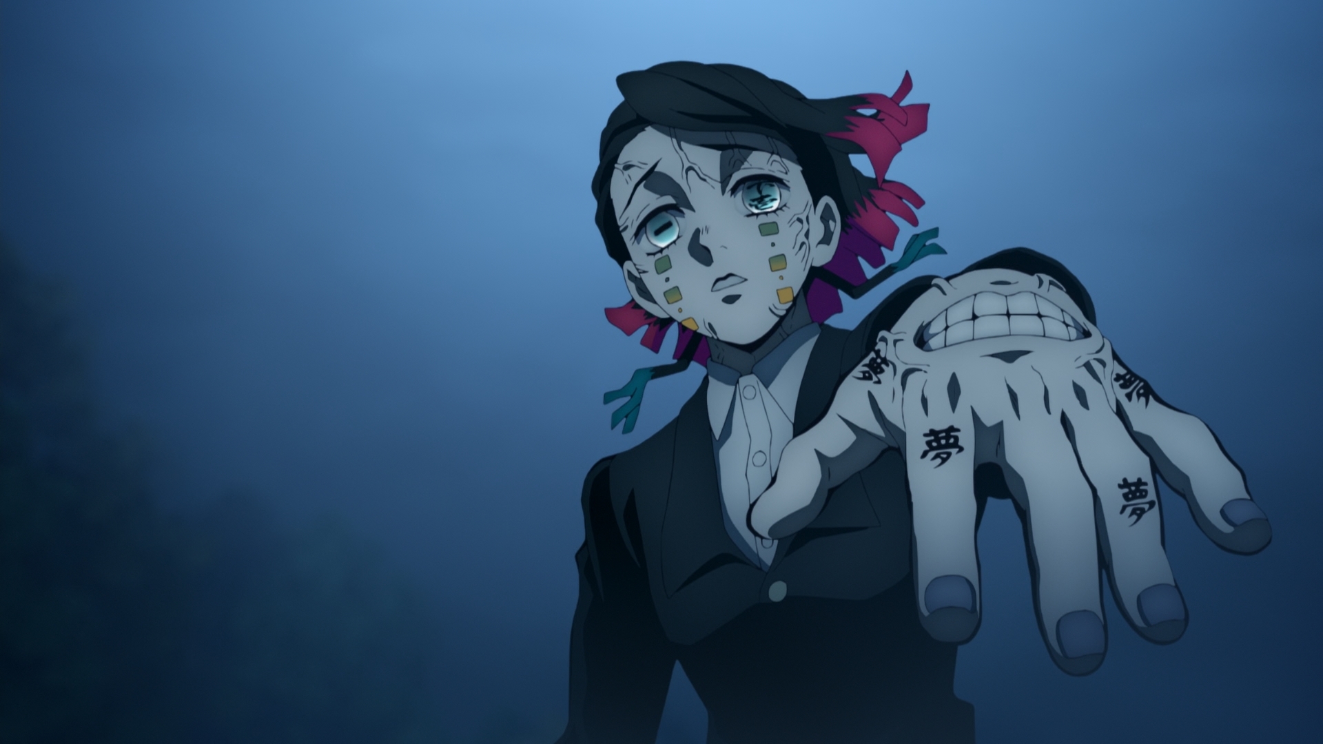 До событий фильма у многих сильных демонов каждой арки, с которыми сталкивалась троица истребителей, была грустная предыстория, и зритель вместе с Тандзиро мог сопереживать, даже когда главгерой их уничтожает. Например, для Кёгая, его демоническая игра в барабаны была потребностью быть признанным. Или вот RuiРуй пытался восполнить свои семейные узы, которые он сам когда-то и разрушил, игрой в семью демонов. И на этом было выстроено противопоставление с семейными узами Тандзиро и Нэдзуко. У Эмму же нет ничего подобного. Это просто безумный садист, позволяющий своим жертвам испытать их величайшие мечты во сне лишь для того, чтобы превратить их блаженство в кошмар и разрушить их разум. Если бы не его дизайн, Эмму, вероятно, был бы самым проходным злодеем франшизы.