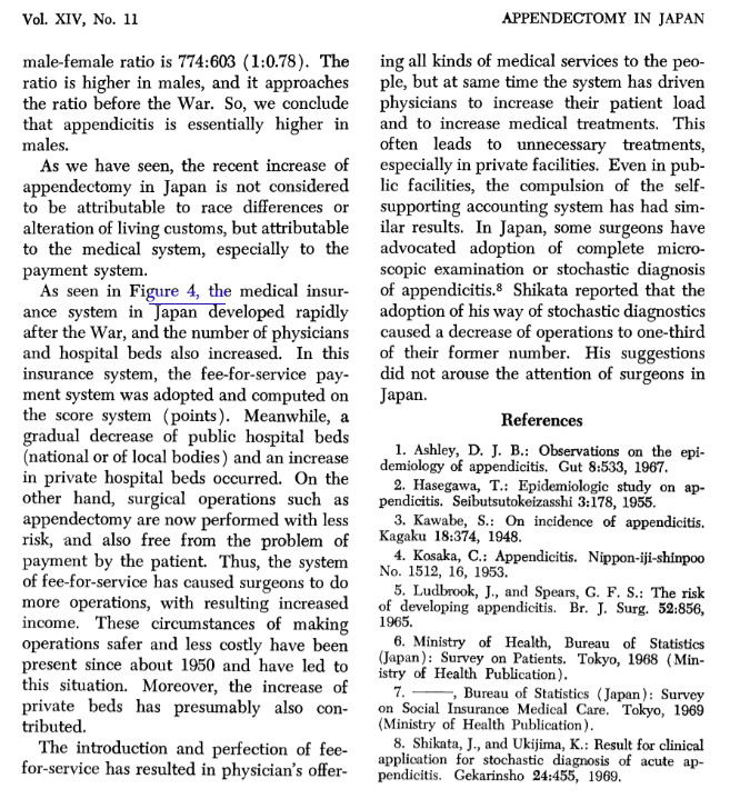 Насколько я понял, два автора (кстати, сами японцы) ничего не пишут про обязательное удаление этого отростка слепой кишки у детей. Они выдвинули гипотезу, что введенная после Второй мировой войны система страхования в Японии играла на руку врачам (особенно в частных клиниках), назначавших большее, чем в других странах, количество лекарств и чаще проводивших аппендэктомию, поскольку последняя была относительно безвредной, но в то же время довольно дорогой операцией. В общем, можно было заработать деньги, не особо навредив пациентам.