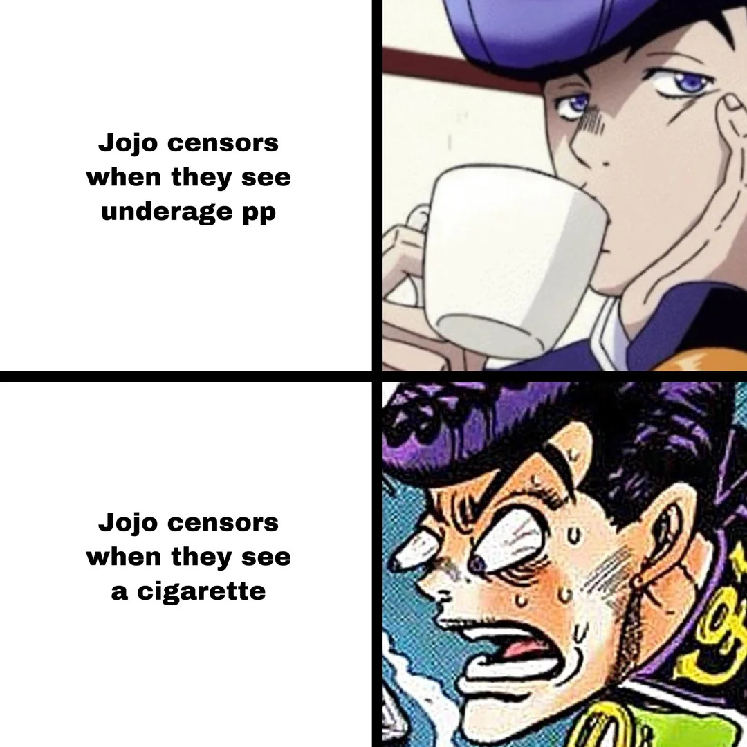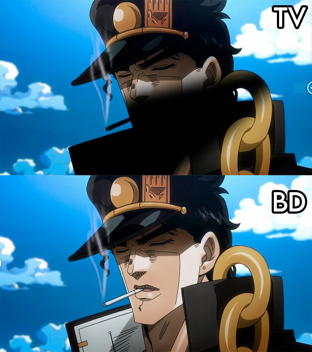 Всё ещё не могу понять, почему они не зацензурили его маленькую пипирку, а сигарету у Джотаро зацензурили.