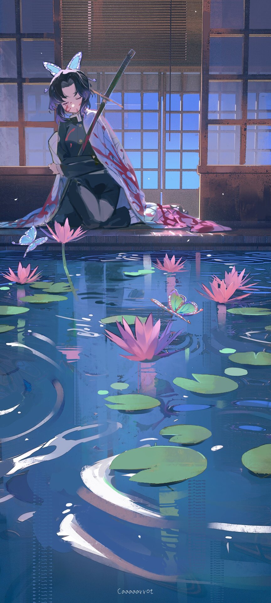 «Столп насекомого» в организации охотников за демонами. Поверх униформы носит хаори в форме крыльев бабочки с сетчатым рисунком, который остался ей от старшей сестры, Канаэ Котё. У Синобу хрупкое телосложение, а меч тонкий, поэтому она не может отсечь демону голову, в отличие от других охотников. Однако благодаря знанию фармацевтики использует яды из глицинии, которые смертельны для демонов. Наносит смеси ядов на меч, переключая механизм, встроенный в его ножны. Уколы этим мечом и составляют техники её «дыхания насекомого».