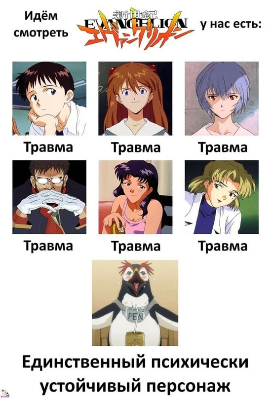 Тепловодный пингвин («hot spring penguin», то есть пингвин, живущий в тёплых источниках), живущий у Мисато Кацураги в качестве питомца. Похож на хохлатого пингвина, но хохолок красного цвета. На крыльях-ластах имеются по три пальца или когтя, выполняющих роль пальцев, что нетипично для птиц. Конкретный вид установить сложно. Носит на себе странное устройство неизвестного назначения: спереди бирка-крепёж с надписью «PEN²», сзади что-то вроде плотно прилегающего к телу баллона или рюкзака. Занимает специально отведённый для него холодильник. Обладает сверхъестественными для пингвина способностями: Пен-Пен смотрит телевизор, читает газеты, сам принимает ванну, управляет своим «жилищем», понимает человеческую речь, ест человеческую еду. В одной из последних серий Мисато отдаёт Пен-Пена для его безопасности в семью Хораки.