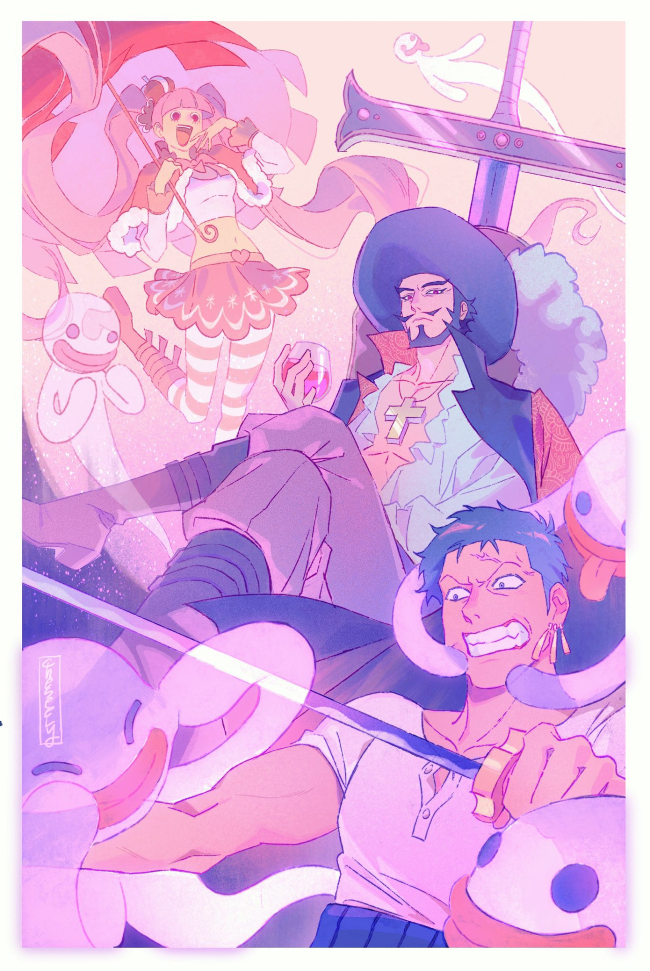 Самый сильный мечник в мире. По праву называется в мире «Монстром из монстров». Предположительно, имеет самую внушительную награду среди всех ситибукаев. Одним взмахом меча может разрубить ледяные скалы, корабли и огромные стены. Мечта Зоро — победить Михоука, чтобы присвоить себе его статус.
